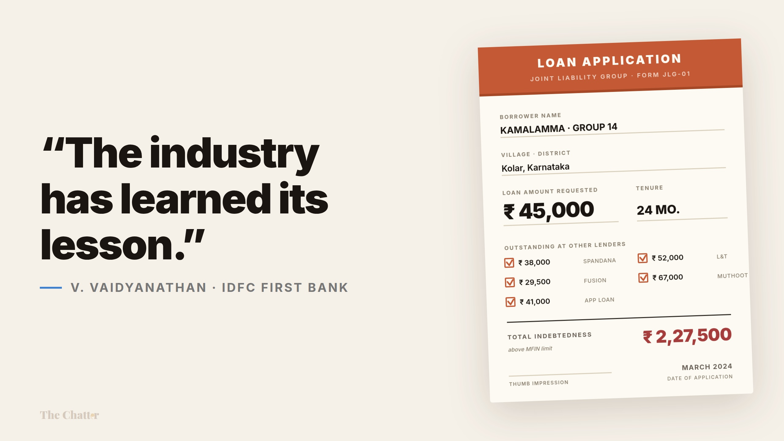 The impact on new business was immediate. At Muthoot Microfin, about 11% of loan applications that would previously have been approved were now being rejected under the new rules. Satin Creditcare reported that at the time the guardrails kicked in, just 1% of their existing clients exceeded the four-lender cap — a sign that some companies had been more disciplined than others.