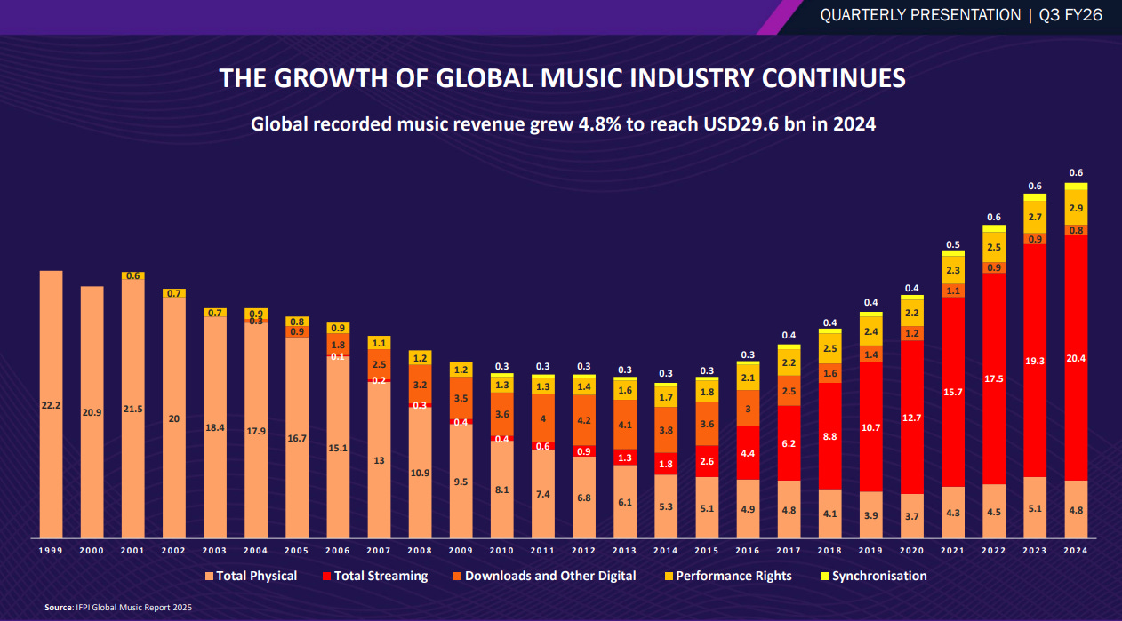 India’s music subscription penetration stands at just 1%, far below developed markets like Sweden (50%), USA (42%), and UK (38%), and even trailing emerging peers like Brazil and China at 13%. This low penetration presents massive growth potential, with ARPU in emerging markets having 4x headroom compared to developed markets. Expanding digital payments, affordable data, and increasing adoption of premium content are expected to drive a subscription-led monetization boom in India, offering significant upside for players like Saregama.