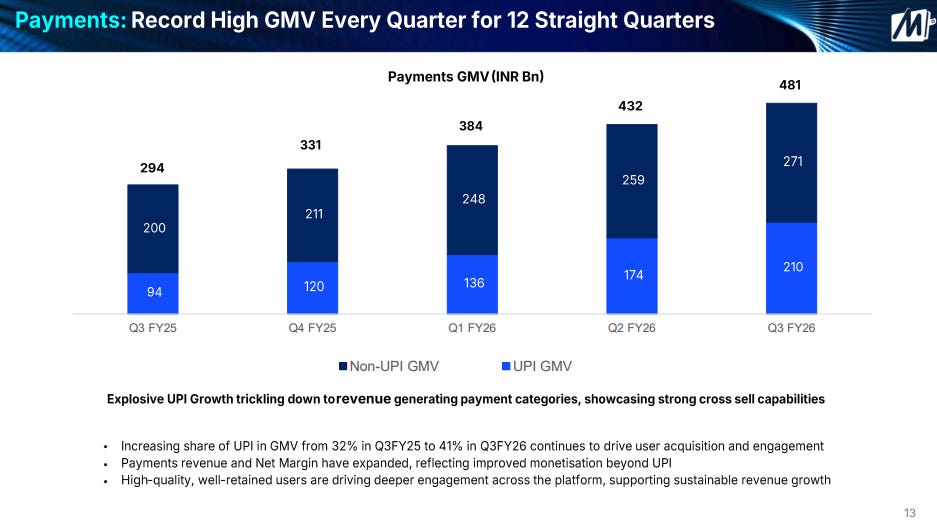 MobiKwik has achieved record-high Gross Merchandise Value (GMV) for 12 consecutive quarters, reaching ₹481 billion in Q3 FY26. UPI now accounts for 41% of total GMV, up from 32% in Q3 FY25, driven by strong user acquisition and engagement. Non-UPI payment categories continue to contribute significantly at ₹271 billion in Q3 FY26, showcasing the platform’s ability to monetize beyond UPI. The company highlights that explosive UPI growth is trickling down to other revenue-generating payment categories, with high-quality, well-retained users driving deeper engagement and sustainable revenue growth across the platform.