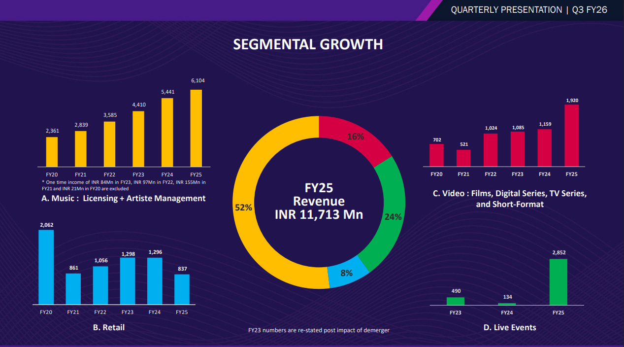 Saregama’s total revenue in FY25 stood at ₹11,713 million, with music licensing and artist management contributing 52%, making it the largest segment. The retail business (Carvaan) has declined from ₹2,062 million in FY20 to ₹837 million in FY25, reflecting a shrinking market for physical music devices. The video segment—comprising films, digital series, TV shows, and short-format content—has grown steadily from ₹702 million in FY20 to ₹1,920 million in FY25, now accounting for 16% of total revenue. Live events have surged dramatically from ₹490 million in FY23 to ₹2,852 million in FY25, capturing 24% of revenue and emerging as a major growth driver for the company.