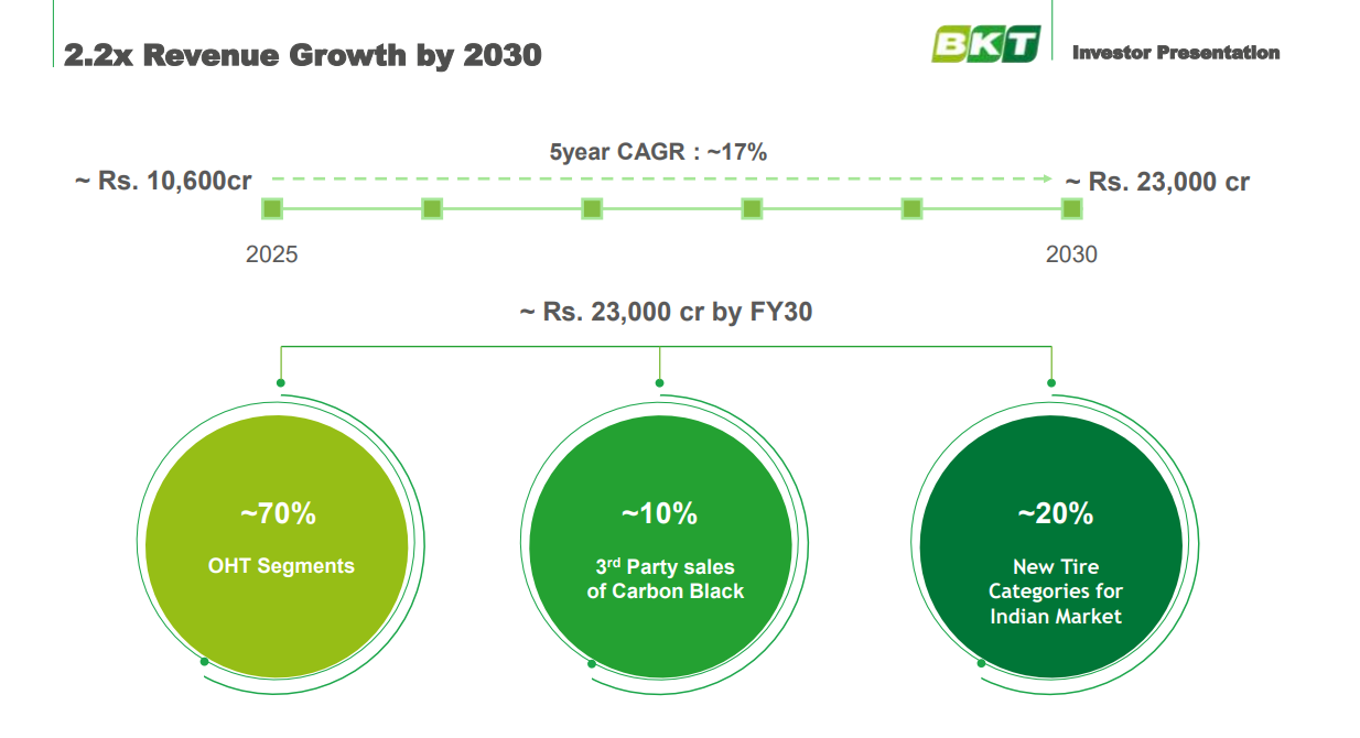 BKT is targeting a revenue of ₹23,000 crore by FY30, more than doubling from ₹10,600 crore in 2025—a compound annual growth rate of around 17%. The growth strategy is built on three pillars: OHT (Off-Highway Tire) segments will contribute roughly 70% of revenues, third-party sales of carbon black will account for about 10%, and new tire categories for the Indian market will make up around 20%. This diversified approach aims to drive sustainable expansion over the next five years.