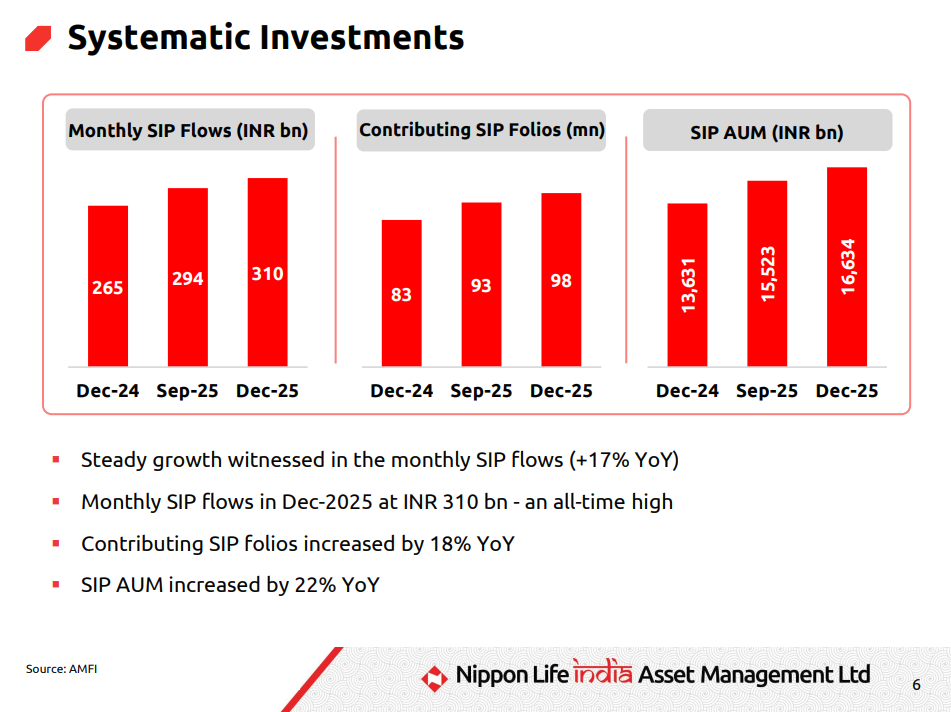 Systematic Investment Plan (SIP) flows have been climbing steadily, reaching an all-time high of ₹310 billion in December 2025, up 17% year-on-year. The number of contributing SIP folios has also grown by 18% YoY to 98 million, indicating broader retail participation. As a result, total SIP AUM has surged 22% YoY to ₹16.6 trillion by December 2025. The consistent growth in SIP inflows and active accounts reflects the increasing popularity of disciplined, long-term investing among Indian retail investors.