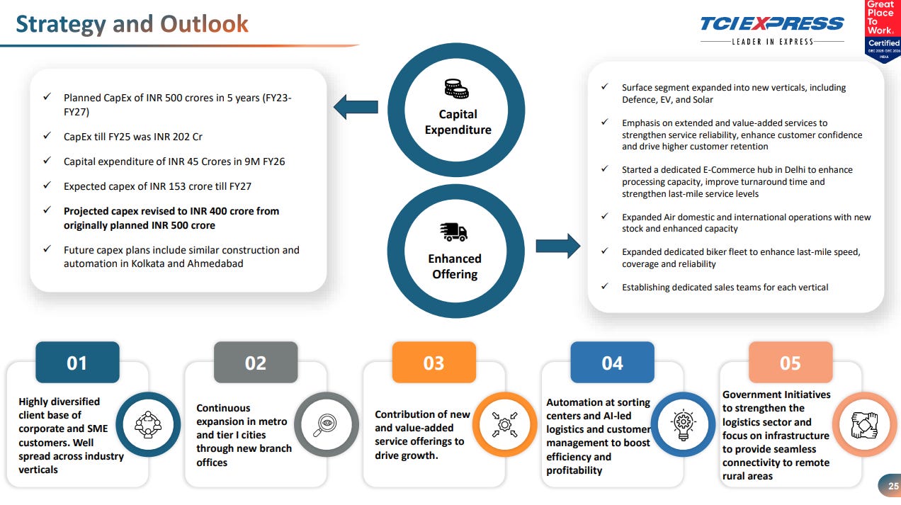 TCI Express is planning a revised capex of ₹400 crore through FY27, down from the original ₹500 crore target, with ₹45 crore already spent in 9M FY26. The investment will focus on expanding infrastructure in Kolkata and Ahmedabad, and enhancing service offerings across defence, EV, solar, and e-commerce verticals. The company is expanding its air freight operations, setting up a dedicated e-commerce hub in Delhi, and increasing its biker fleet for faster last-mile delivery. Additionally, TCI is adopting automation and AI-led logistics at sorting centers to improve efficiency, while leveraging government infrastructure initiatives to strengthen its pan-India presence across metro and tier-1 cities.