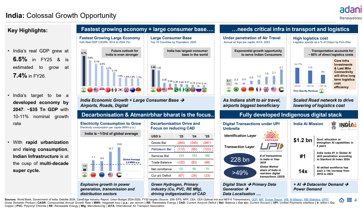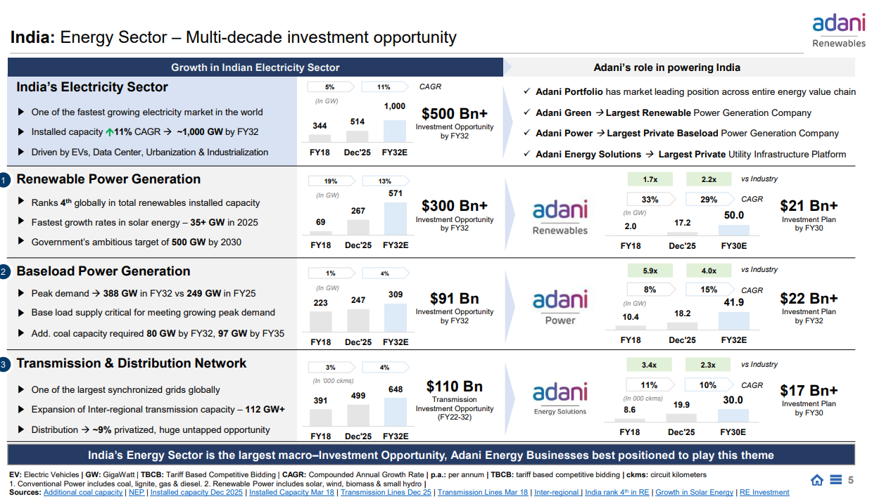 India’s energy sector presents a multi-decade investment opportunity, with total electricity capacity projected to grow from 344 GW in FY18 to over 1,000 GW by FY32, requiring $500 billion+ in investments. Renewable power generation is set to expand from 69 GW in FY18 to 571 GW by FY32E, driven by government targets and $300 billion+ in investment, with India ranking 4th globally in renewables capacity. Baseload power generation will grow from 223 GW to 309 GW by FY32E, requiring an additional 80-97 GW of coal capacity to meet rising peak demand. Transmission and distribution networks, already among the world’s largest synchronized grids, need $110 billion in investments as inter-regional capacity expands to 112 GW+, with distribution remaining 91% privatized, presenting a huge untapped opportunity. Adani’s portfolio is strategically positioned across this value chain, with Adani Green as the largest renewable power company, Adani Power as the largest private baseload power company, and Adani Energy Solutions as the largest private utility infrastructure platform, collectively planning $60 billion+ in investments by FY30.