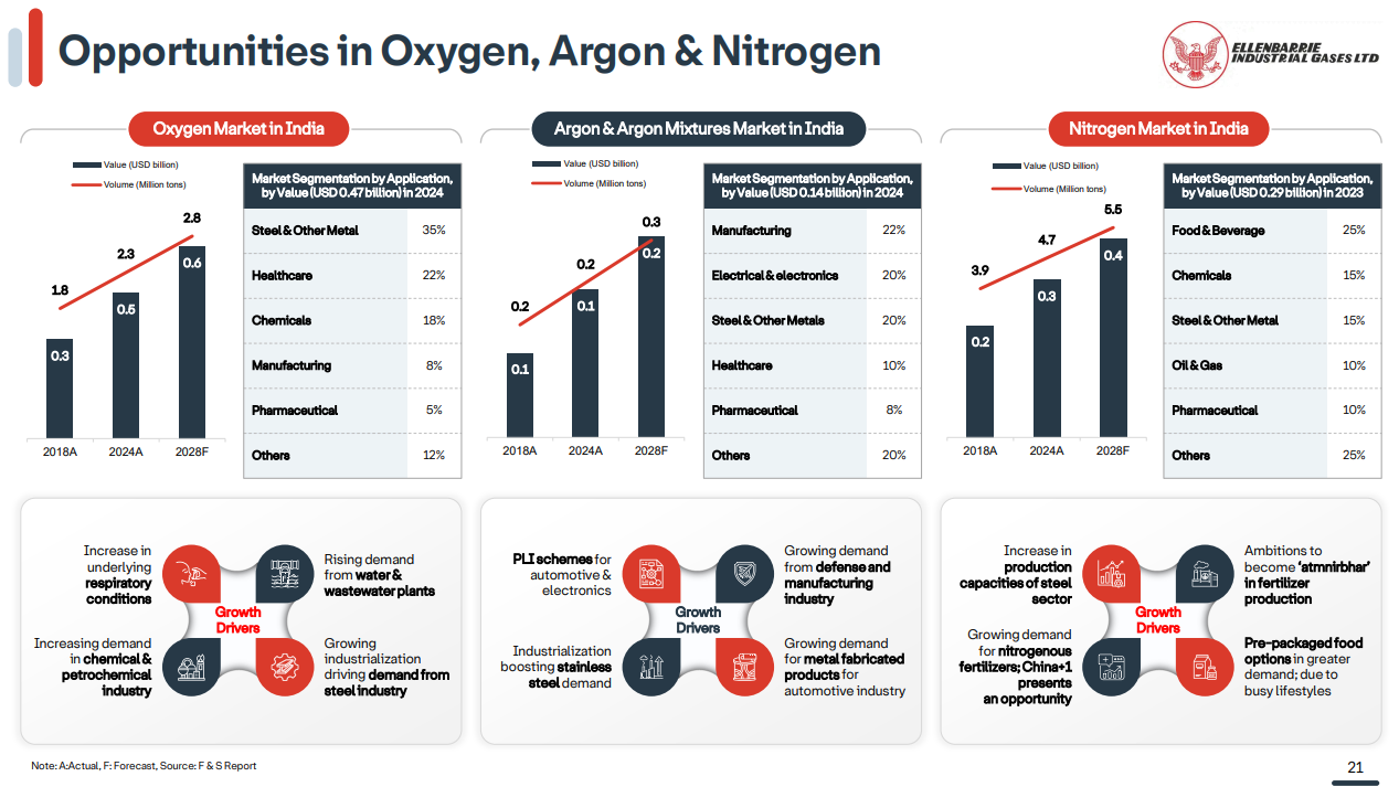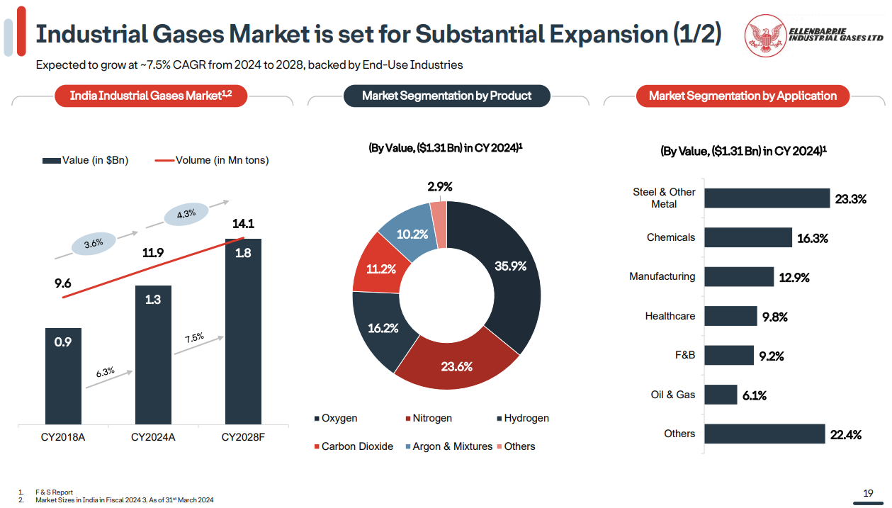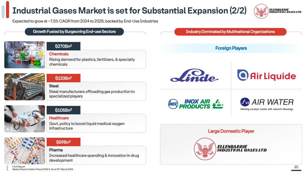 The industrial gases market is being driven by burgeoning demand from key end-use sectors. Chemicals lead at $270 billion, fueled by rising demand for plastics, fertilizers, and specialty chemicals. Steel follows at $133 billion, with manufacturers increasingly offloading gas production to specialized players. Healthcare is projected at $105 billion, supported by government policy to boost liquid medical oxygen infrastructure, while pharma stands at $59 billion, driven by increased healthcare spending and innovation in drug development. The industry is dominated by multinational players like Linde, Air Liquide, Inox Air Products, and Air Water, while Ellenbarrie Industrial Gases Ltd. stands out as a large domestic player competing in this space.
