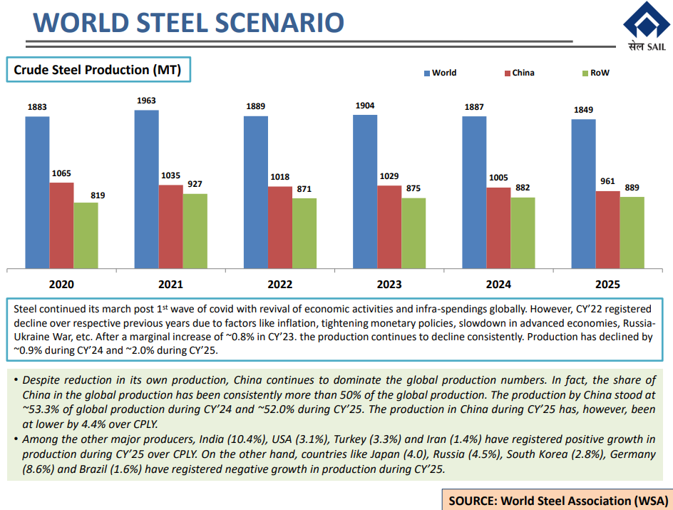 Global crude steel production peaked at 1,963 MT in 2021 during the post-COVID recovery, but has been declining since, dropping to 1,849 MT in 2025. China remains the dominant player, accounting for over 50% of global output, though its production fell 4.4% in 2025 compared to the previous year. The Rest of World has seen mixed performance—India, USA, Turkey, and Iran have grown, while Japan, Russia, South Korea, Germany, and Brazil have recorded declines. Overall, the steel industry is facing headwinds from inflation, monetary tightening, and slower economic activity in advanced markets.