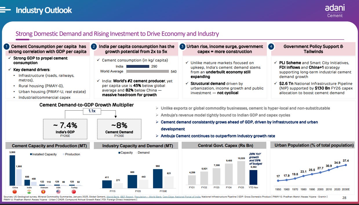 India’s cement demand is tightly linked to GDP growth, with a 7.4% GDP forecast for FY26E translating to an estimated 8% cement demand growth due to a 1.1x multiplier effect. India’s per capita cement consumption is just 290 kg, far below the global average of 540 kg, indicating massive room for growth from 2x to 5x as the economy expands. Key demand drivers include infrastructure projects (roads, railways, metros), rural housing under PMAY-G, urban housing and real estate (PMAY-U), and industrial/commercial capex, all fueled by urbanization, rising incomes, and structural demand that is non-cyclical. Government policy support through PLI schemes, Smart City Initiatives, FDI inflows, and the China+1 strategy are further bolstering long-term industrial cement demand growth. Central government capex has surged from ₹4,256 billion in FY21 to ₹10,520 billion in FY25, with a 29% year-over-year increase in November alone, while urban population is projected to rise from 27.7% in 2000 to 37.4% by 2030E, driving sustained cement demand ahead of GDP growth rates.