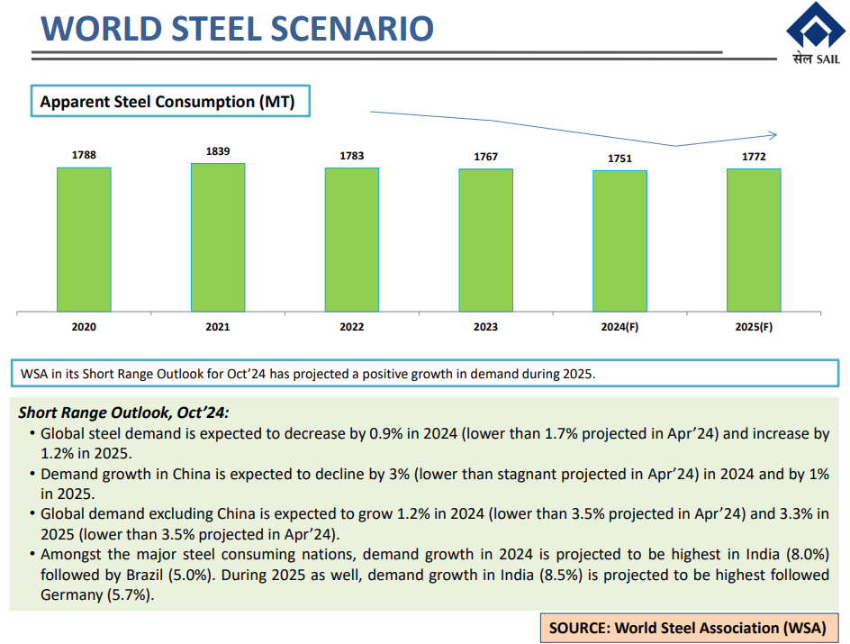 Global steel consumption has been on a downward trend since peaking at 1,839 MT in 2021, falling to 1,751 MT in 2024. However, the World Steel Association expects a modest recovery in 2025, with demand projected to grow 1.2% to 1,772 MT. China’s steel demand is expected to decline by 3% in 2024 and another 1% in 2025, while markets outside China are set to grow stronger—up 1.2% in 2024 and 3.3% in 2025. India stands out as the brightest spot, with demand growth projected at 8% in 2024 and 8.5% in 2025, the highest among major steel-consuming nations.