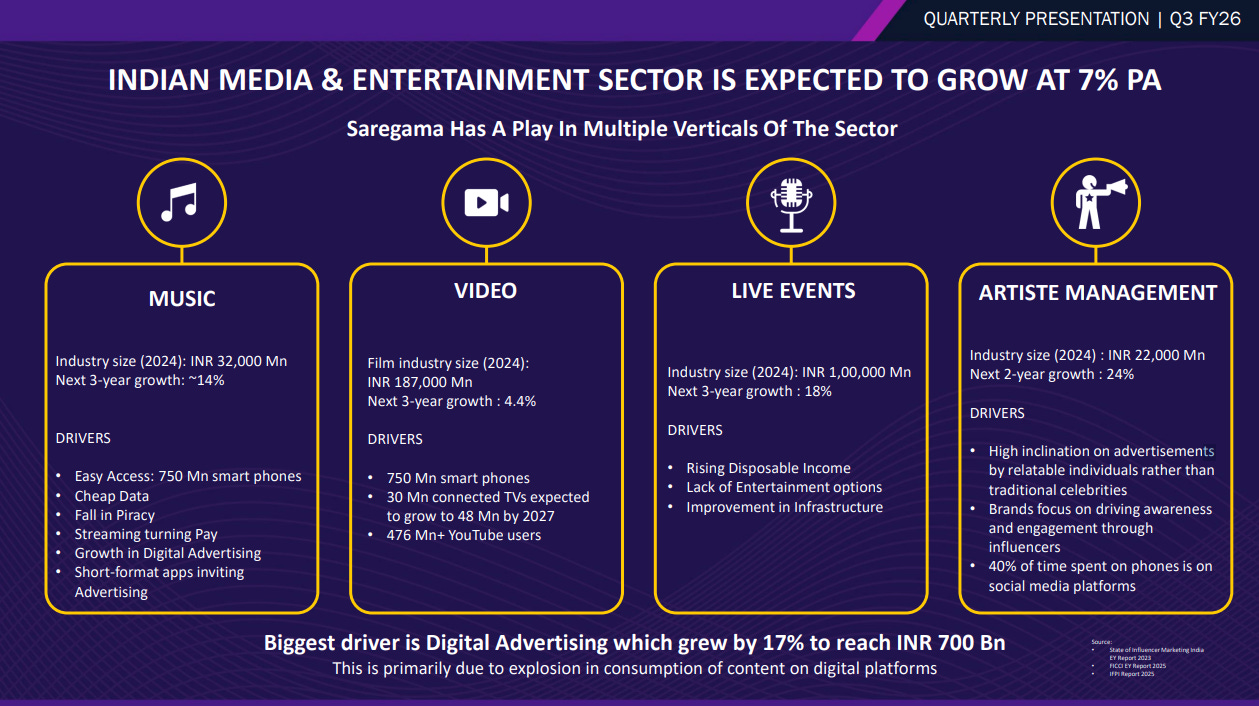India’s media and entertainment sector is projected to grow at 7% annually, with Saregama positioned across multiple high-growth verticals. The music industry, valued at ₹32,000 million in 2024, is set to grow ~14% over the next three years, driven by 750 million smartphones, cheap data, and the rise of streaming and digital advertising. The video segment, worth ₹187,000 million, is expected to grow 4.4% as connected TV households expand from 30 million to 48 million by 2027. Live events, valued at ₹100,000 million, are projected to grow 18%, fueled by rising disposable incomes and better infrastructure, while artist management (₹22,000 million) is set to grow 24% as brands increasingly leverage relatable influencers and social media engagement. Digital advertising, the biggest growth driver, surged 17% to reach ₹700 billion, reflecting the explosion of content consumption on digital platforms.