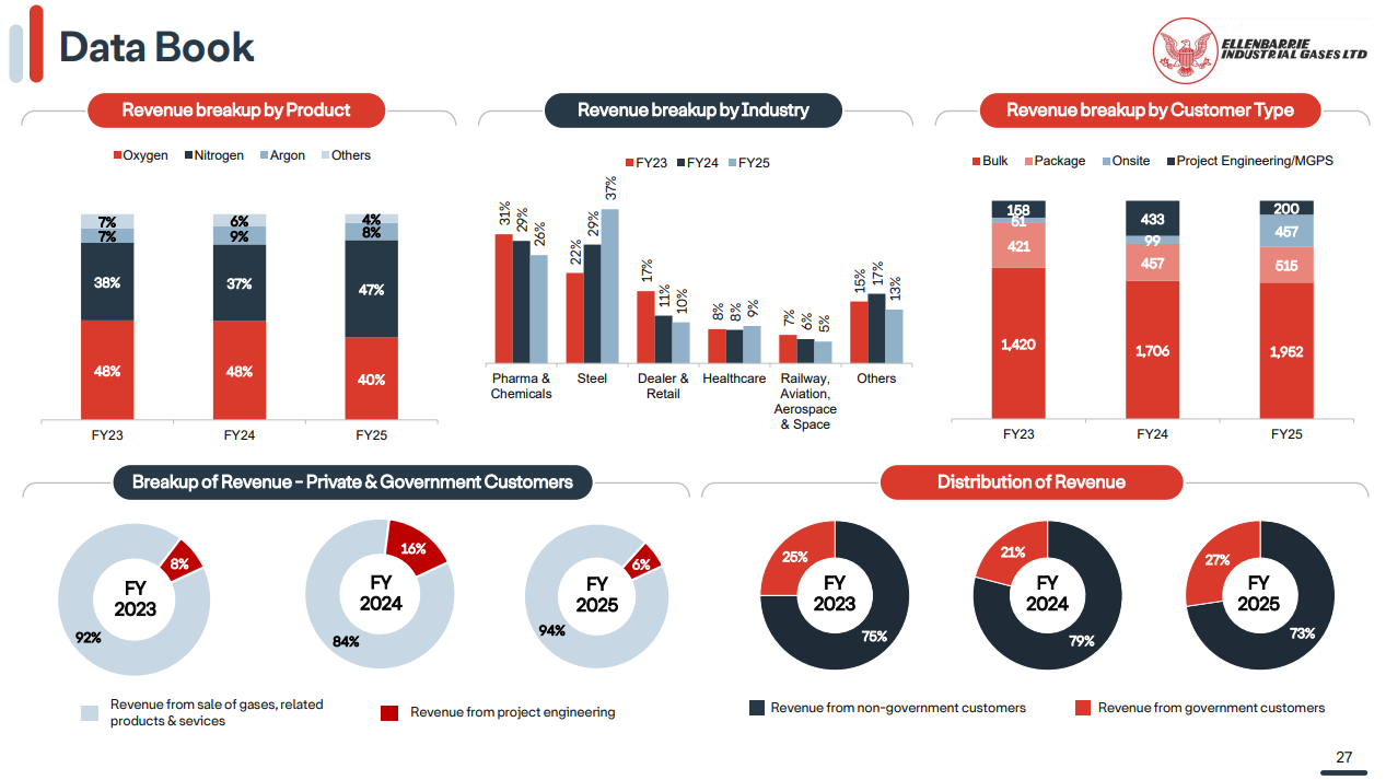 Ellenbarrie’s revenue mix shows oxygen consistently contributing around 48%, nitrogen at 37-38%, and argon at 4-6% across FY23-FY25. By industry, steel has been the largest segment at 37% in FY23, declining to 27% by FY25, while pharma and chemicals remain stable around 22-31%. By customer type, bulk customers account for the largest share at ₹1,962 crore in FY25, followed by package customers at ₹1,706 crore and onsite at ₹433 crore, with project engineering contributing an additional ₹200 crore. Revenue from non-government customers dominates at 73-79%, though government-related revenue (including project engineering) has grown from 21% in FY23 to 27% in FY25, driven by project engineering, which increased from 8% in FY23 to 16% in FY24 and remains at 6% in FY25.