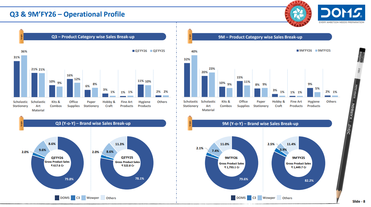 DOMS’ operational profile for Q3 and 9M FY26 shows scholastic stationery as the largest category, contributing 31% and 32% respectively, followed by scholastic art material at 21% and 20%. Brand-wise, DOMS dominates with nearly 80% of sales in both periods, while its sub-brands C3 and Wowper contribute around 8-11% and 2-3% respectively. Gross product sales stood at ₹617.6 crore in Q3 FY26 and ₹1,793.1 crore for 9M FY26, showing consistent performance across categories. The diversified product mix across stationery, art materials, kits, and office supplies reflects DOMS’ strong positioning in multiple segments.