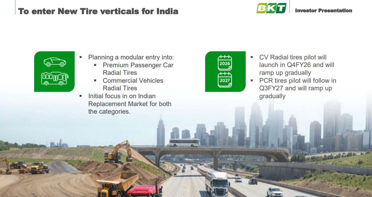 BKT is planning a modular entry into new tire verticals for the Indian market, targeting premium passenger car radial tires and commercial vehicle radial tires. The initial focus will be on the Indian replacement market for both categories. The company will pilot CV radial tires starting in Q4 FY26, followed by PCR tires in Q3 FY27, with both segments ramping up gradually. This strategic move aims to diversify BKT’s product portfolio beyond its traditional off-highway tire stronghold.