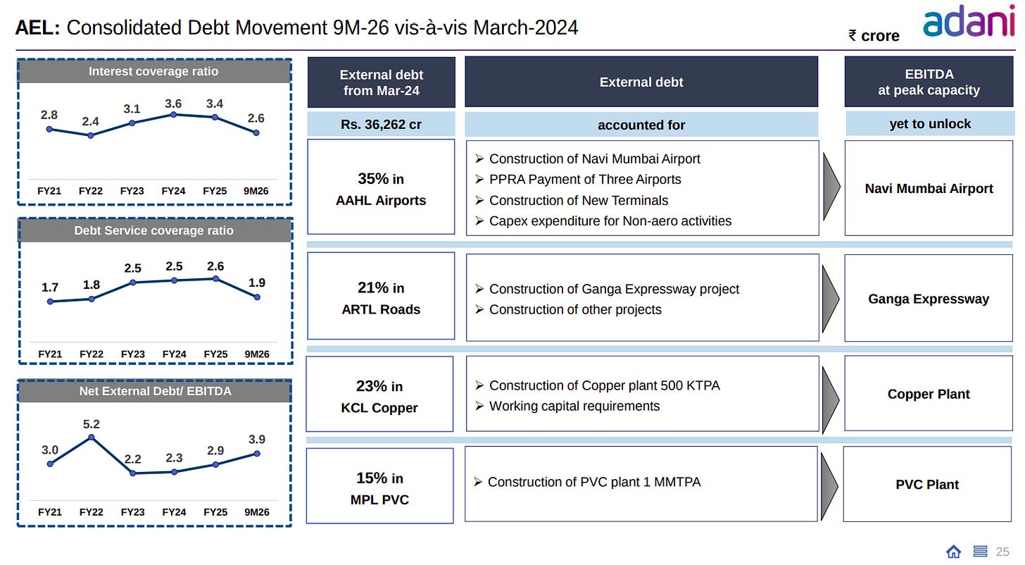 AEL’s debt increase is largely front-loaded capex debt tied to long-gestation infrastructure assets, not stress—~₹36,000 cr of external debt is funding airports, roads, copper and PVC projects that are still under construction, which explains why leverage metrics look optically weaker today but are expected to normalize as EBITDA ramps up once Navi Mumbai Airport, Ganga Expressway, and the copper/PVC plants move to peak utilization.