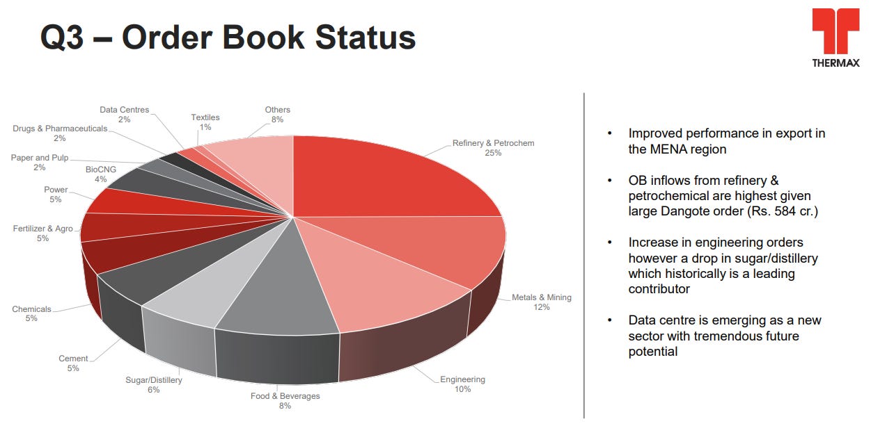Thermax’s order book for Q3 is dominated by refinery and petrochemical projects at 25%, boosted by a large Rs. 584 crore Dangote order. Engineering orders are picking up at 10%, but sugar and distillery projects have slowed to 6%—a concern since this segment has traditionally been a strong performer. Data centres are emerging as a new opportunity at 2%, hinting at future growth potential in this space.