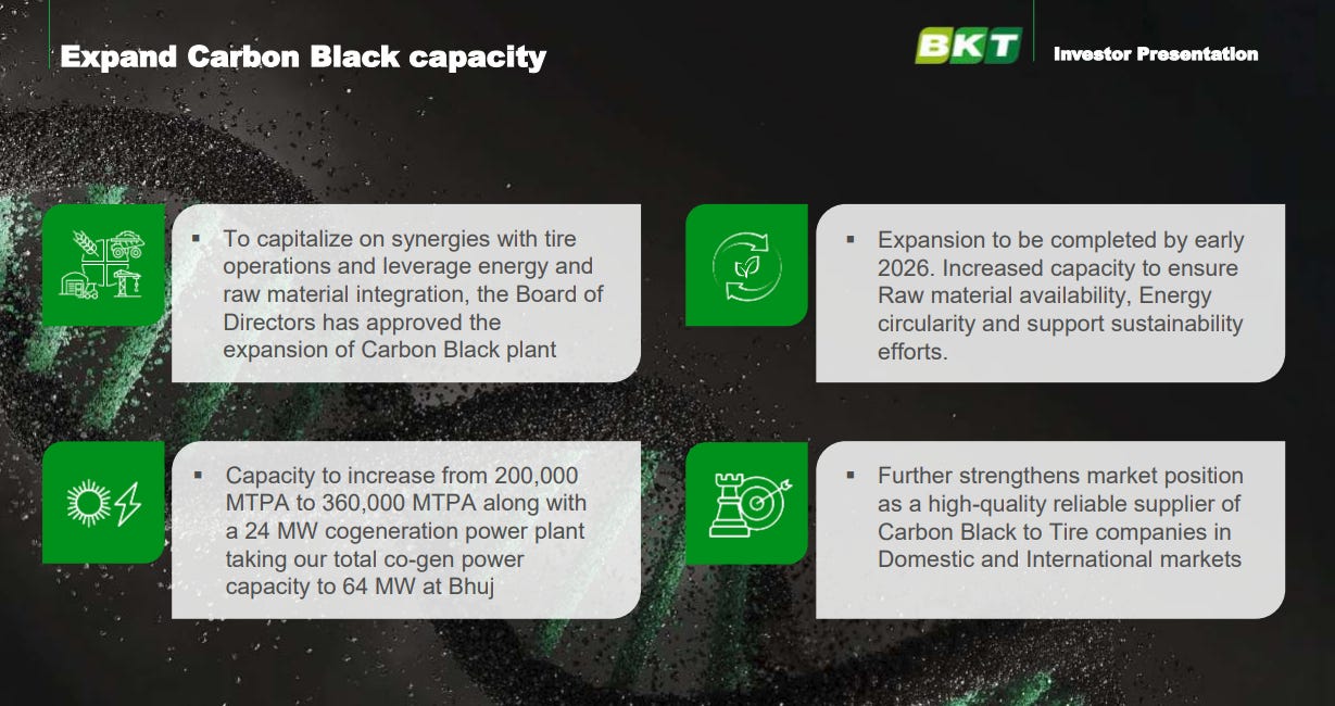BKT’s Board has approved the expansion of its carbon black plant to capture synergies with tire operations and improve raw material integration. Capacity will increase from 200,000 MTPA to 360,000 MTPA, with a new 24 MW cogeneration power plant boosting total co-gen capacity to 64 MW at Bhuj. The expansion is expected to be completed by early 2026 and will enhance raw material availability, energy circularity, and sustainability efforts. This move also strengthens BKT’s position as a reliable carbon black supplier to tire companies in both domestic and international markets.