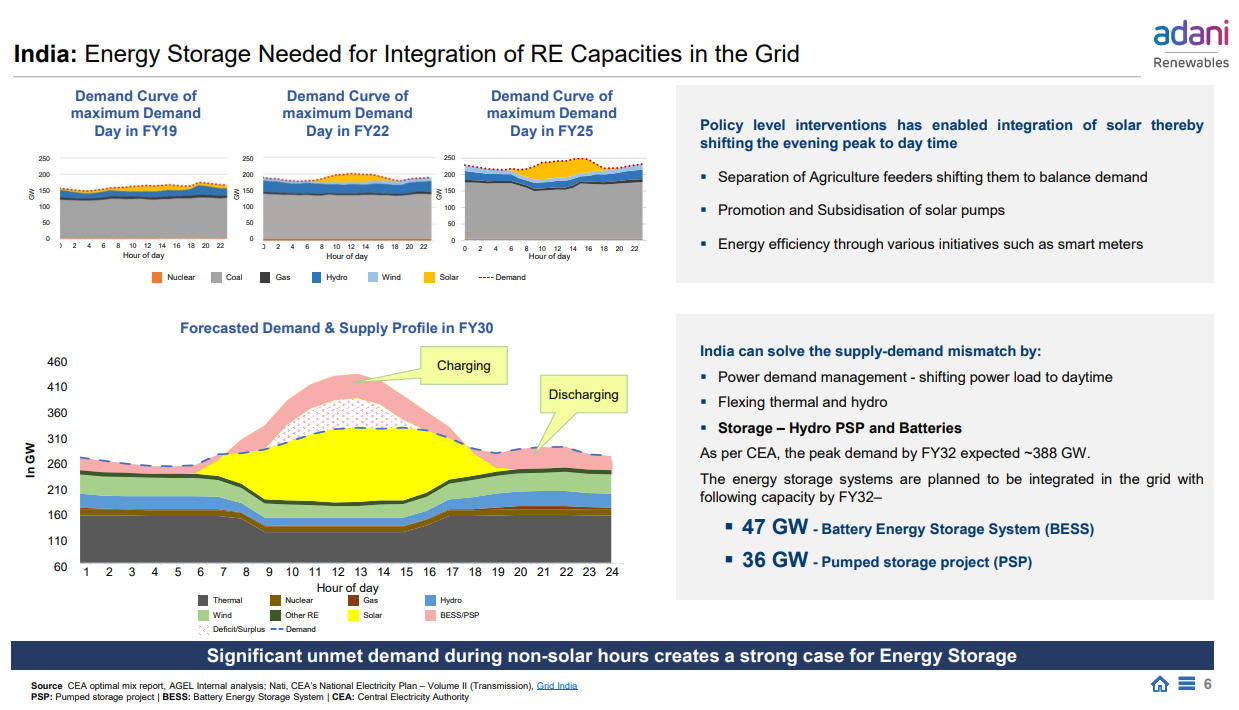 India’s energy grid faces a supply-demand mismatch as solar integration increases, with evening demand peaks shifting to daytime due to policy interventions like agriculture feeder separation, solar pump promotion, and smart meters. By FY30, peak demand is expected to hit around 388 GW, but significant unmet demand during non-solar hours creates a strong case for energy storage. India plans to integrate 47 GW of Battery Energy Storage Systems (BESS) and 36 GW of Pumped Storage Projects (PSP) by FY32 to address this gap. Forecasted demand and supply profiles show charging during solar-rich hours and discharging during evening peaks, with storage, hydro pumping, and thermal/hydro flexibility helping balance the grid. Policy-level interventions have already enabled better solar integration by flattening the evening peak, but energy storage remains critical to managing the grid’s evolving dynamics.