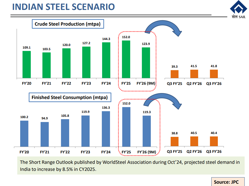 India’s crude steel production peaked at 152 MTPA in FY25 but is projected to decline to 123.9 MTPA in FY26, with quarterly output holding steady around 41-42 MTPA. Finished steel consumption also hit a high of 152 MTPA in FY25 but is expected to drop to 119.3 MTPA in FY26, with quarterly demand remaining flat at around 38-40 MTPA. Despite the projected dip in FY26, the World Steel Association forecasts an 8.5% growth in Indian steel demand for CY2025, signaling optimism for the sector. The mismatch between production and consumption trends suggests adjustments in inventory or export-import dynamics.
