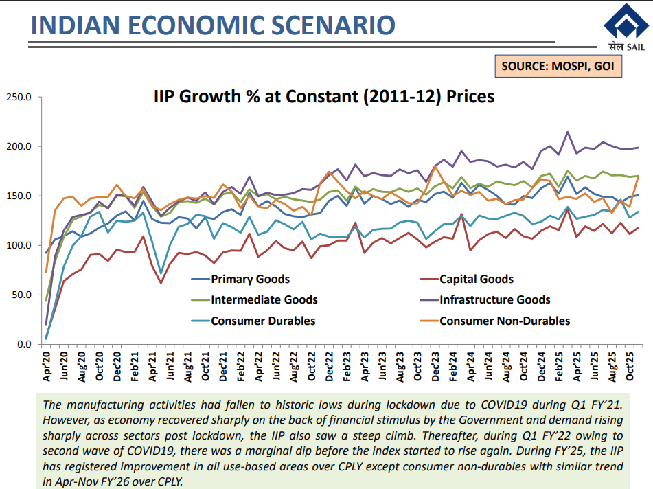India’s Index of Industrial Production (IIP) crashed during the COVID lockdowns in Q1 FY21 but recovered steadily as the economy reopened and government stimulus kicked in. Infrastructure goods have led the recovery, climbing to over 200 on the index, while capital goods have remained relatively subdued around 120. In FY25, IIP has shown improvement across most categories compared to the previous year, except for consumer non-durables, which continue to lag. The trend suggests manufacturing activity is rebounding, though consumer non-durables remain a weak spot even into FY26.