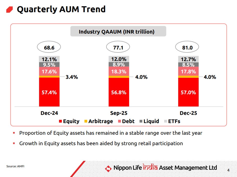 The mutual fund industry’s quarterly average assets under management (QAAUM) has grown from ₹68.6 trillion in December 2024 to ₹81 trillion by December 2025. Equity assets dominate the mix, holding steady at around 57% of total AUM throughout this period. The proportion of debt has increased slightly from 17.6% to 17.8%, while liquid funds and ETFs have seen minor shifts. Strong retail investor participation has been a key driver behind the growth in equity assets over the past year.