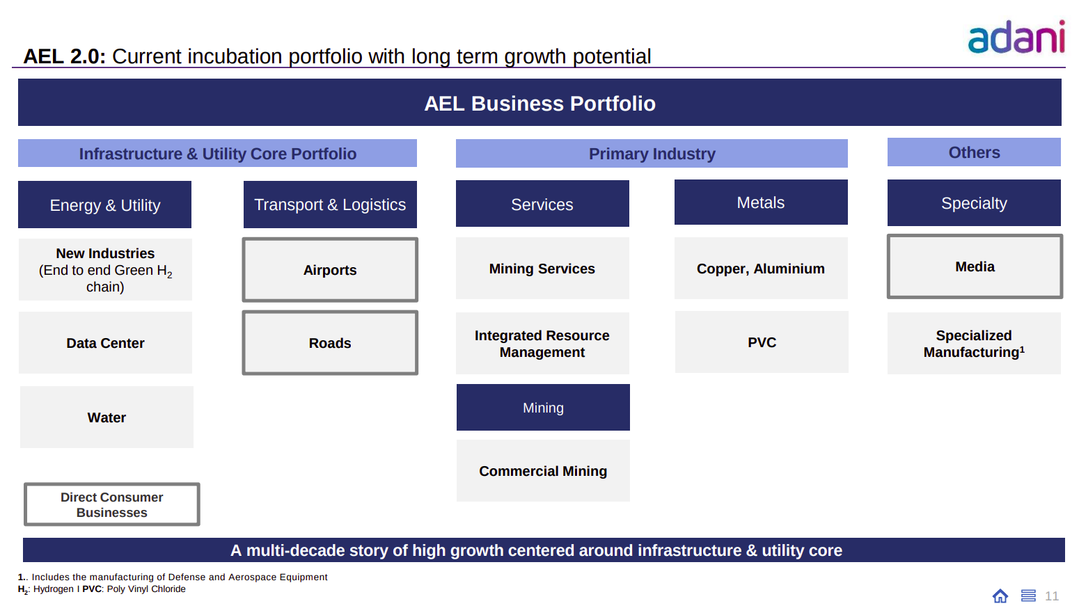 AEL 2.0 is Adani’s long-duration option pool—a portfolio of incubation bets built around infrastructure and utilities, with exposure to future-facing themes like green hydrogen, data centers, airports, mining services, metals, and water, where capital intensity and regulatory complexity create high entry barriers and long-term compounding potential rather than near-term earnings.