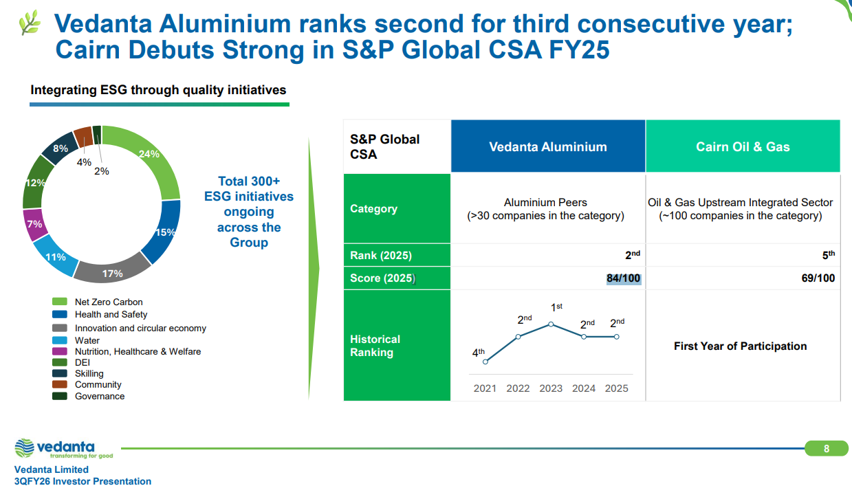 Vedanta Aluminium has secured the 2nd rank in the S&P Global Corporate Sustainability Assessment (CSA) for the third consecutive year, scoring 84/100 among over 30 aluminium peers. The company has steadily improved its ranking from 4th in 2021 to 1st in 2023 and has maintained the 2nd position in 2024 and 2025. Vedanta’s sister concern, Cairn Oil & Gas, debuted strong at 5th rank with a score of 69/100 in the oil and gas upstream integrated sector, marking its first year of participation. The group is driving sustainability through 300+ ESG initiatives across nine focus areas, including net zero carbon (24%), health and safety (15%), innovation and circular economy (17%), and others like water, nutrition, DEI, skilling, community, and governance.