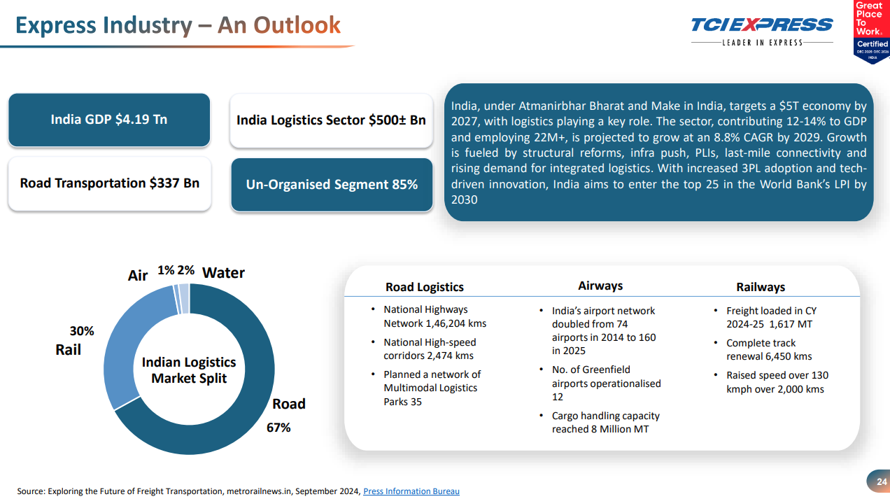 India’s logistics sector is valued at over $500 billion and is expected to grow at 8.8% CAGR through 2029, contributing 12-14% to GDP and employing 22 million people. Road logistics dominates with a 67% market share, supported by a 1.46 lakh km national highways network and 2,474 km of high-speed corridors, though 85% of the segment remains unorganized. Railways account for 30% of the market with ongoing track renewal and speed improvements, while air freight handled 1.6 MT in CY 2024-25, with airport capacity doubling since 2014. The government’s focus on infrastructure, last-mile connectivity, and technology-driven logistics aims to position India among the top 25 in the World Bank’s LPI by 2030.