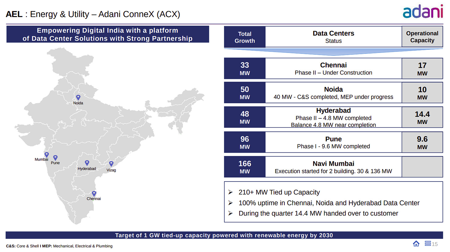 Adani ConneX is Adani’s data-center platform built as a long-term infrastructure play, with capacity already tied up across India’s key digital hubs (Chennai, Noida, Hyderabad, Pune, Navi Mumbai), low initial MW live today but a large pipeline (210+ MW tied-up; 1 GW target by 2030)—signaling a deliberate “build-ahead-of-demand” strategy where execution, uptime, and access to cheap renewable power matter more than near-term utilization.