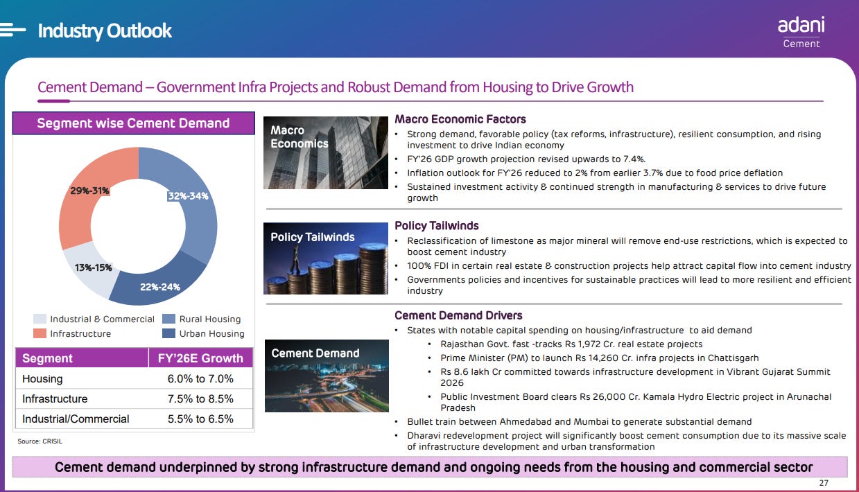 India’s cement demand is expected to grow 6-8.5% in FY26E, driven by government infrastructure projects and robust housing demand. Rural and urban housing account for 54-58% of total cement consumption, while infrastructure makes up 22-24% and industrial/commercial contributes 13-15%. Key growth drivers include GDP growth revised upwards to 7.4%, inflation cooling to 2%, reclassification of limestone as a major mineral, 100% FDI in real estate, and major projects like the ₹14,260 crore Chhattisgarh infra push, ₹8.6 lakh crore Vibrant Gujarat commitments, and ₹26,000 crore Kamala Hydro Electric project. Additionally, the bullet train between Ahmedabad and Mumbai and the Dharavi redevelopment project are expected to generate substantial cement demand, reinforcing strong infrastructure-led growth prospects.