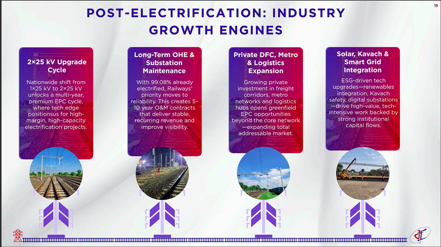 Post-electrification opens multiple long-duration growth levers for rail infrastructure, led by 2×25 kV upgrades, long-term OHE and substation maintenance, and expanding private DFC, metro, and logistics projects. Solar integration, Kavach safety systems, and smart grids further drive high-value, tech-intensive EPC opportunities with recurring revenue visibility.