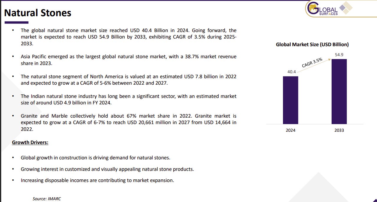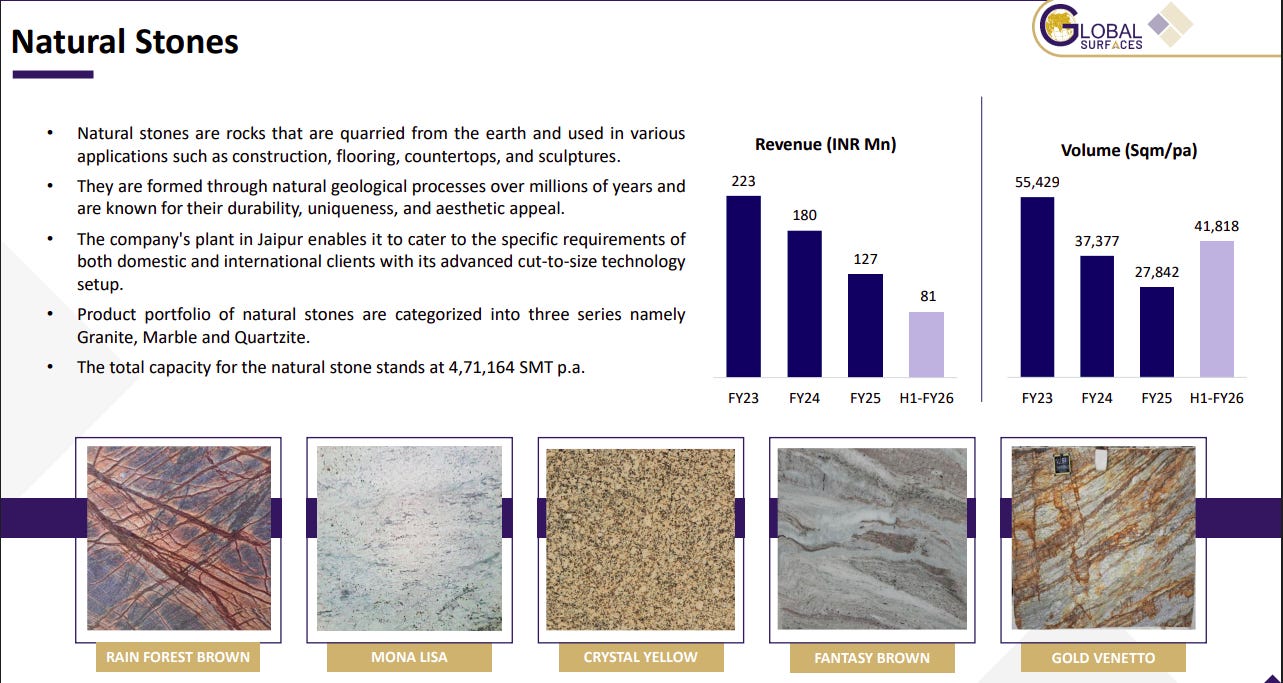 Natural stones are used across construction, flooring, countertops, and décor, valued for durability and aesthetics. The company offers granite, marble, and quartzite, supported by a Jaipur facility and strong cut-to-size capabilities. Revenue and volumes show moderation in FY25, with partial recovery in H1 FY26.