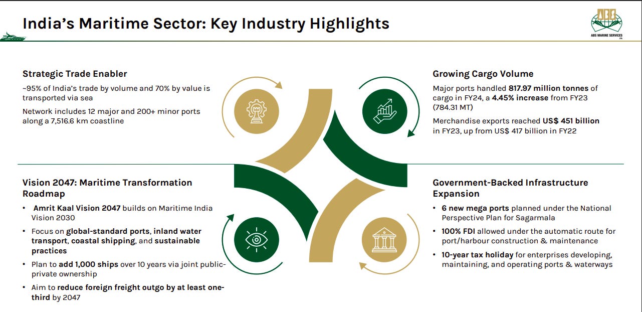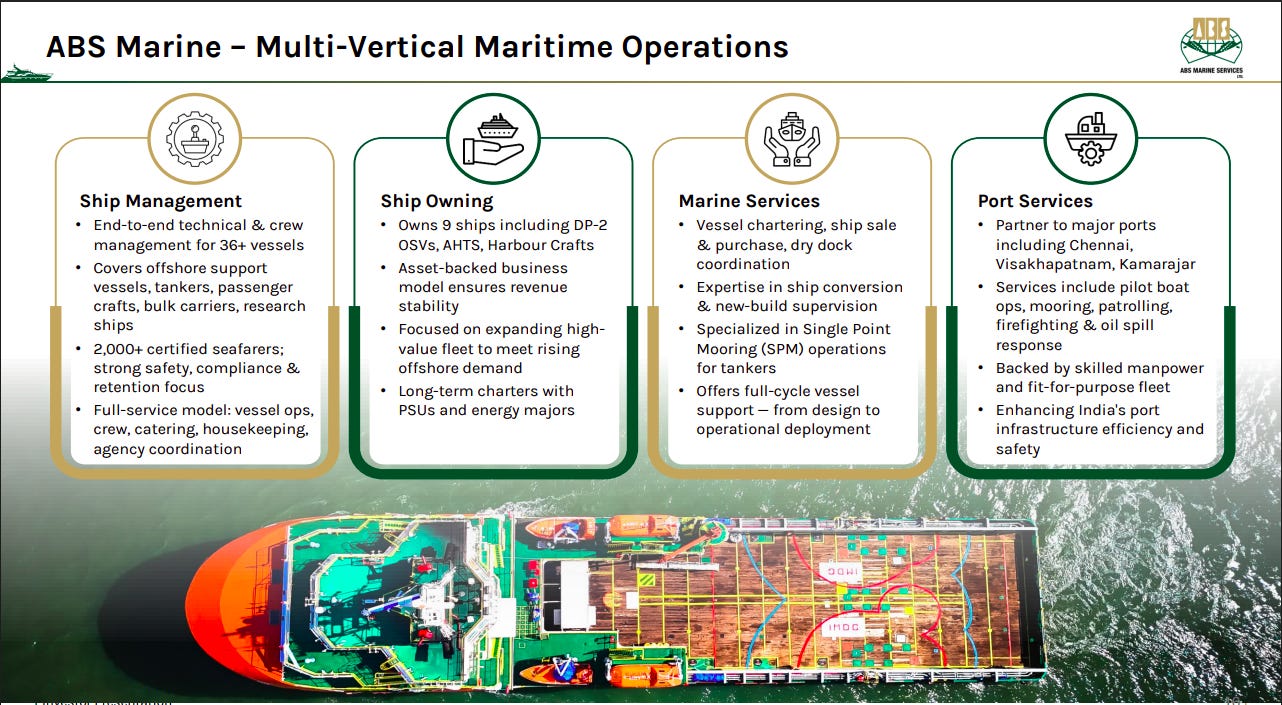 ABS Marine has diversified operations across ship management, ship owning, marine services, and port services, covering the full vessel lifecycle. Its asset-backed fleet, skilled manpower, and long-term charters with PSUs and energy majors create a resilient, scalable maritime platform.