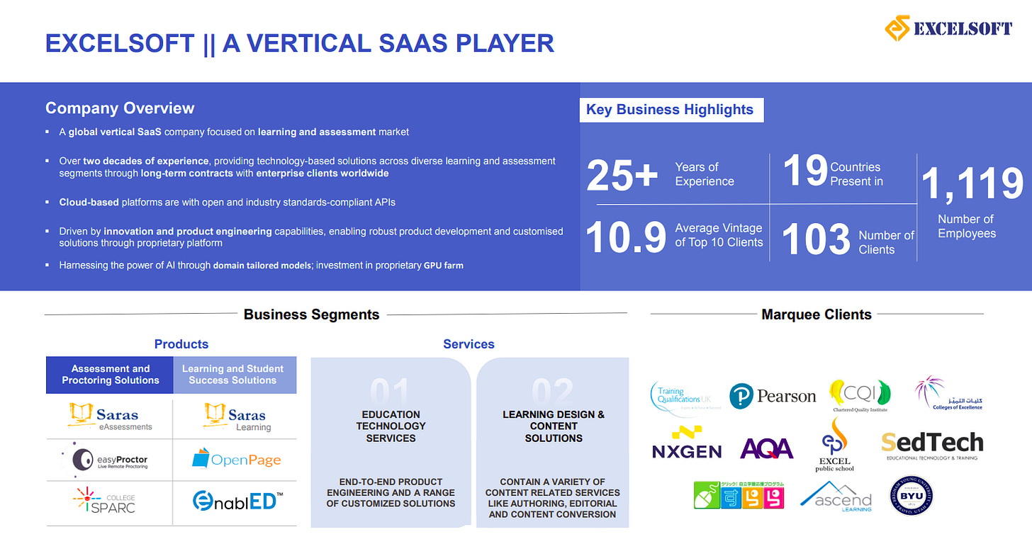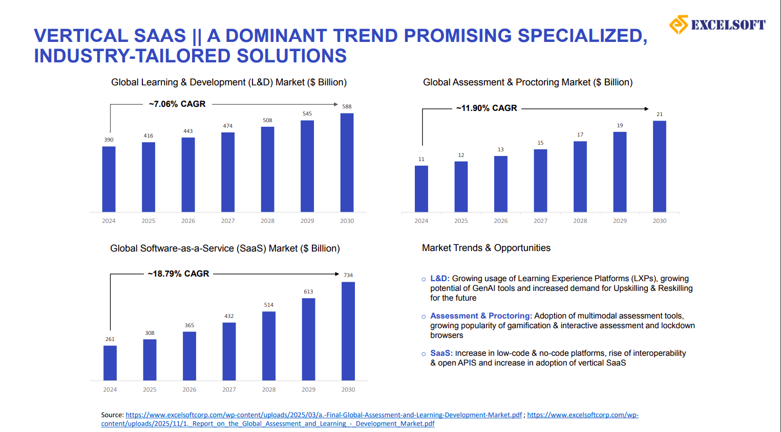 Vertical SaaS is emerging as a dominant trend, supported by steady growth in global L&D (~7% CAGR), assessment & proctoring (~12% CAGR), and SaaS (~19% CAGR) markets. Rising adoption of GenAI, multimodal assessments, low-code platforms, and industry-specific solutions creates a strong long-term opportunity for specialized SaaS players like Excelsoft.