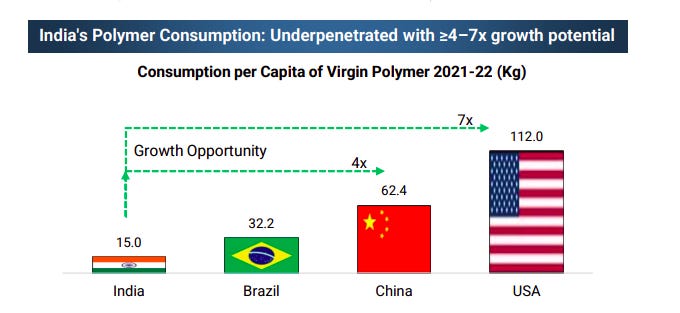 India’s per-capita polymer consumption remains significantly underpenetrated at ~15 kg versus China and the US, indicating a 4–7x long-term growth opportunity. Rising industrialization, packaging demand, and consumption-led growth position India for sustained polymer volume expansion.