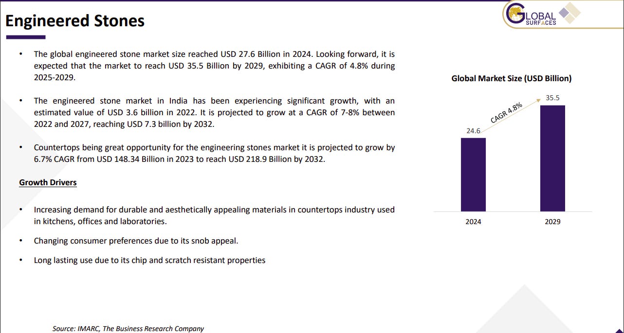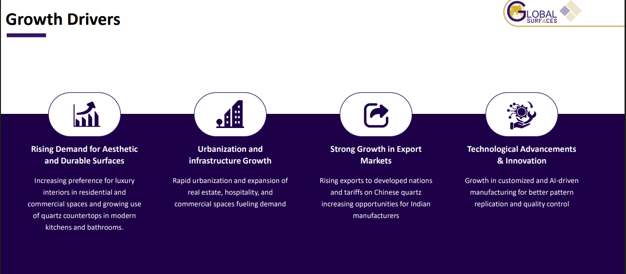Demand is being driven by urbanization, infrastructure expansion, and rising preference for durable, aesthetic surfaces in residential and commercial spaces. Export opportunities are improving, aided by tariffs on Chinese quartz. Technological advancements and AI-driven manufacturing are enhancing customization, quality, and efficiency.