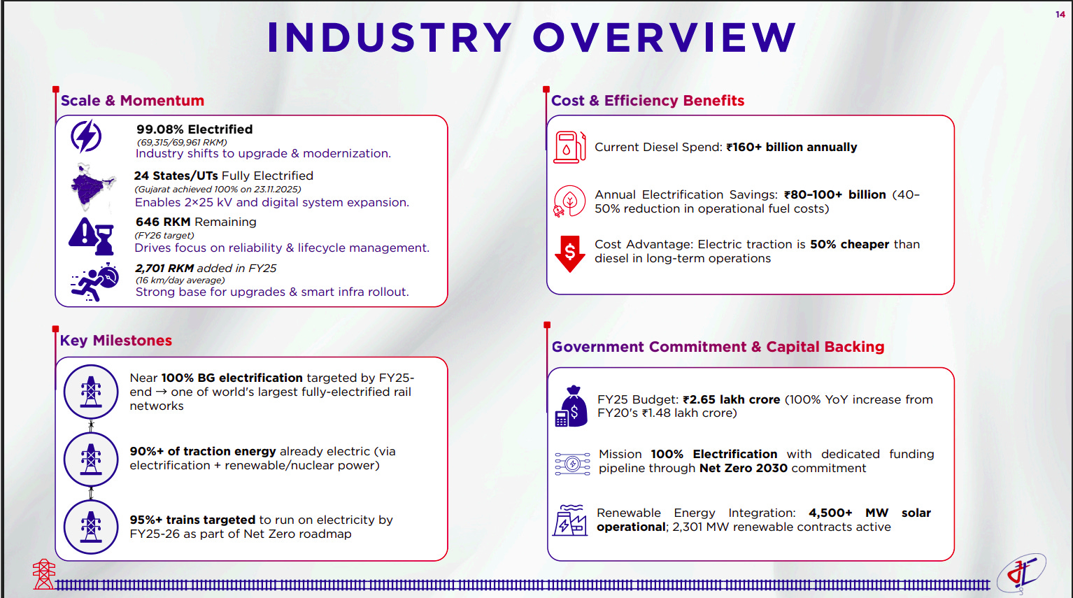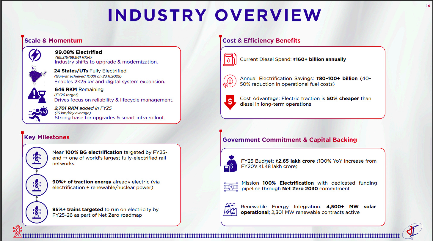 Indian Railways has reached ~99% electrification, creating a large upgrade and modernization opportunity focused on reliability, lifecycle management, and smart infrastructure rollout. Electrification delivers significant cost savings versus diesel, backed by strong government funding, Net Zero commitments, and growing renewable energy integration.