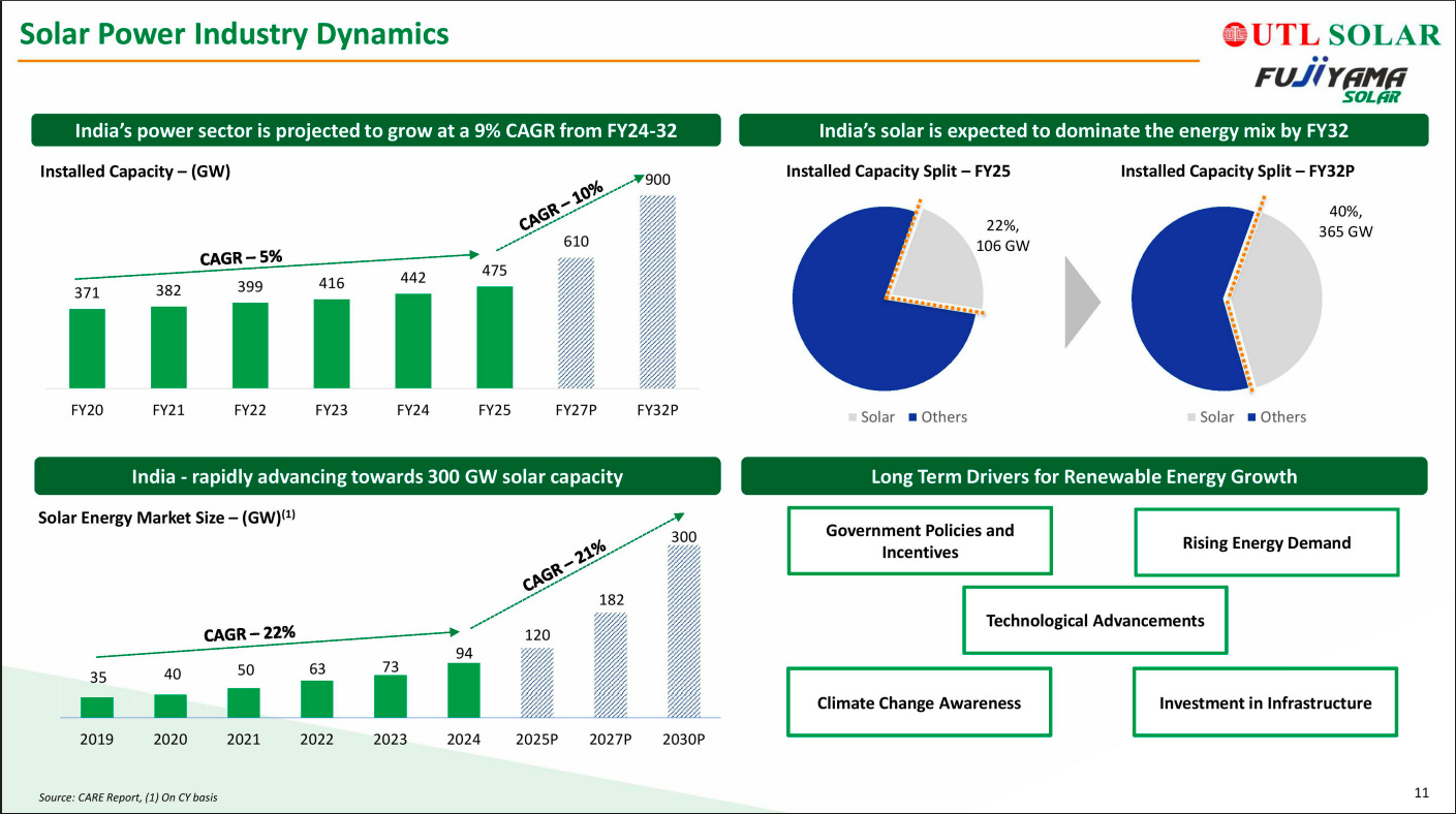 India’s overall power capacity is projected to grow at ~9–10% CAGR, with solar emerging as the dominant energy source by FY32. Solar capacity is expected to scale rapidly toward ~300 GW, driven by strong policy incentives, rising energy demand, and technology improvements. Long-term structural drivers like climate commitments and infrastructure investment underpin sustained renewable growth.