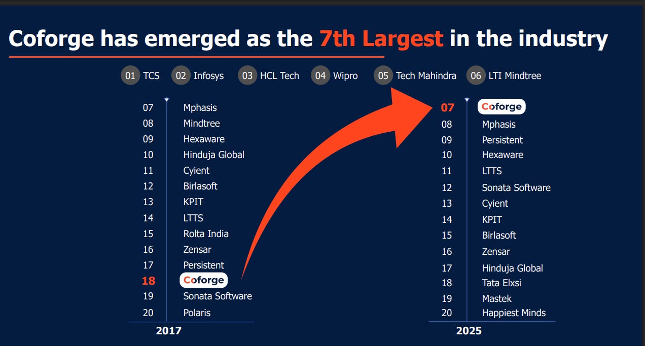 Coforge has climbed rapidly from the 18th position in 2017 to become the 7th largest IT services company by 2025. This rise places it alongside established leaders like TCS, Infosys, and HCL Tech. The shift highlights sustained execution, scale expansion, and increasing relevance among mid-tier IT services firms.