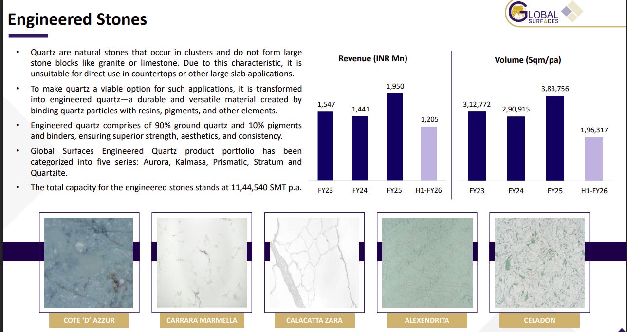 Engineered quartz is manufactured by binding quartz particles with resins, offering superior strength, consistency, and design flexibility. The portfolio spans five series and targets countertops and large slab applications. Despite strong FY25 revenue growth, H1 FY26 volumes softened, reflecting near-term demand normalization.