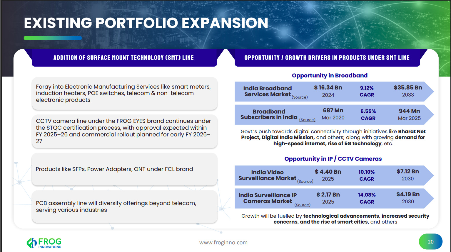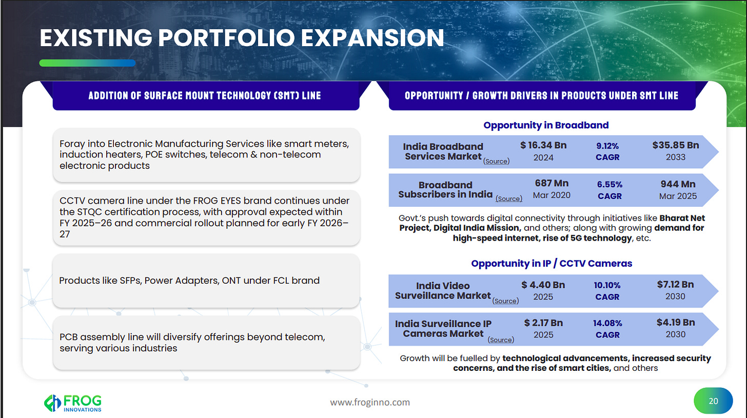 The addition of an SMT line enables FIL’s entry into electronic manufacturing services across telecom and non-telecom products, including CCTV, broadband equipment, and power adapters. Large, fast-growing markets in broadband and video surveillance provide clear monetization opportunities.