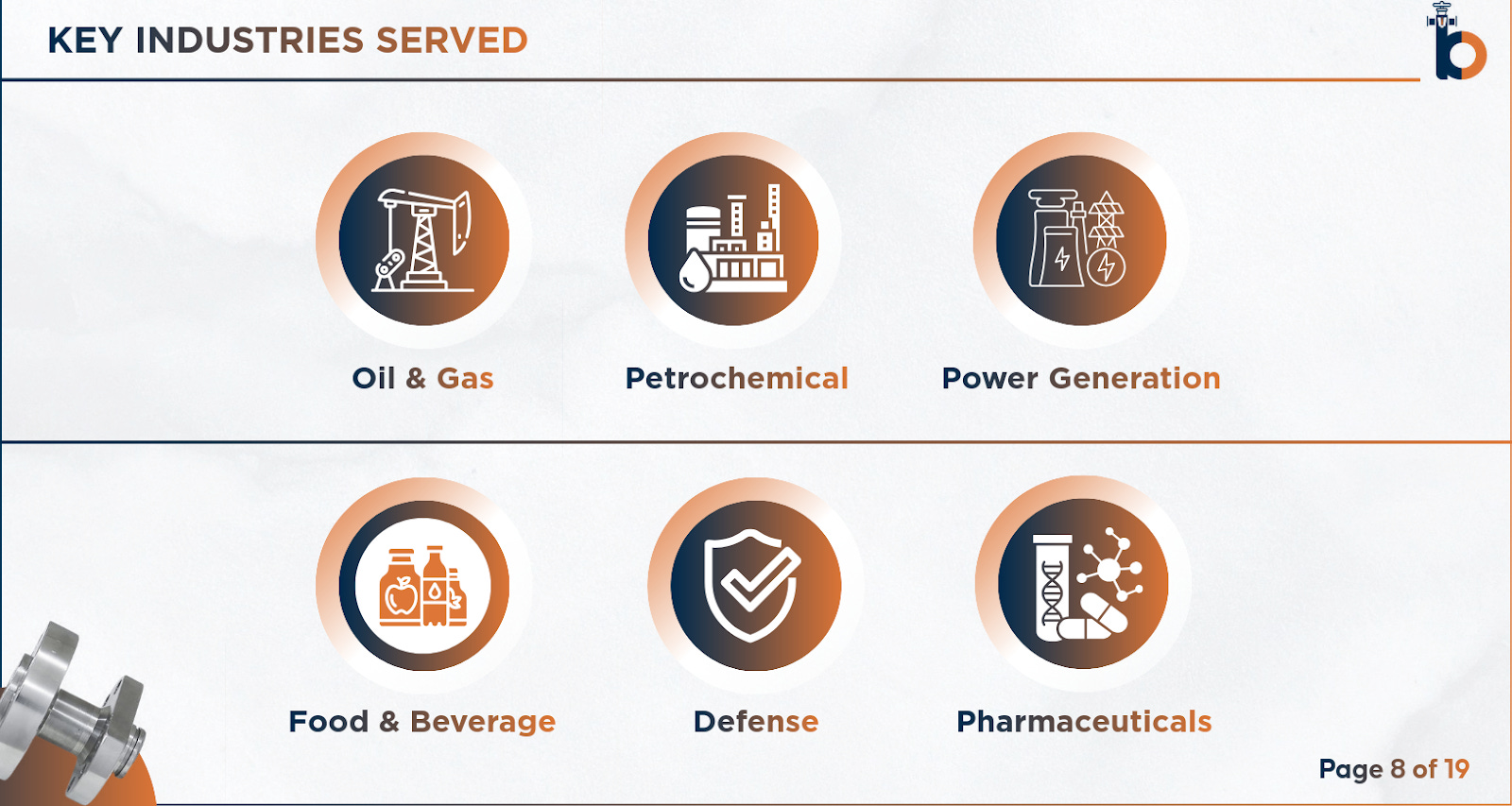 This slide highlights the company’s diversified end-market exposure across Oil & Gas, Petrochemicals, Power Generation, Food & Beverage, Defense, and Pharmaceuticals. It underscores a broad industrial footprint that reduces concentration risk while tapping into both cyclical and regulated sectors.