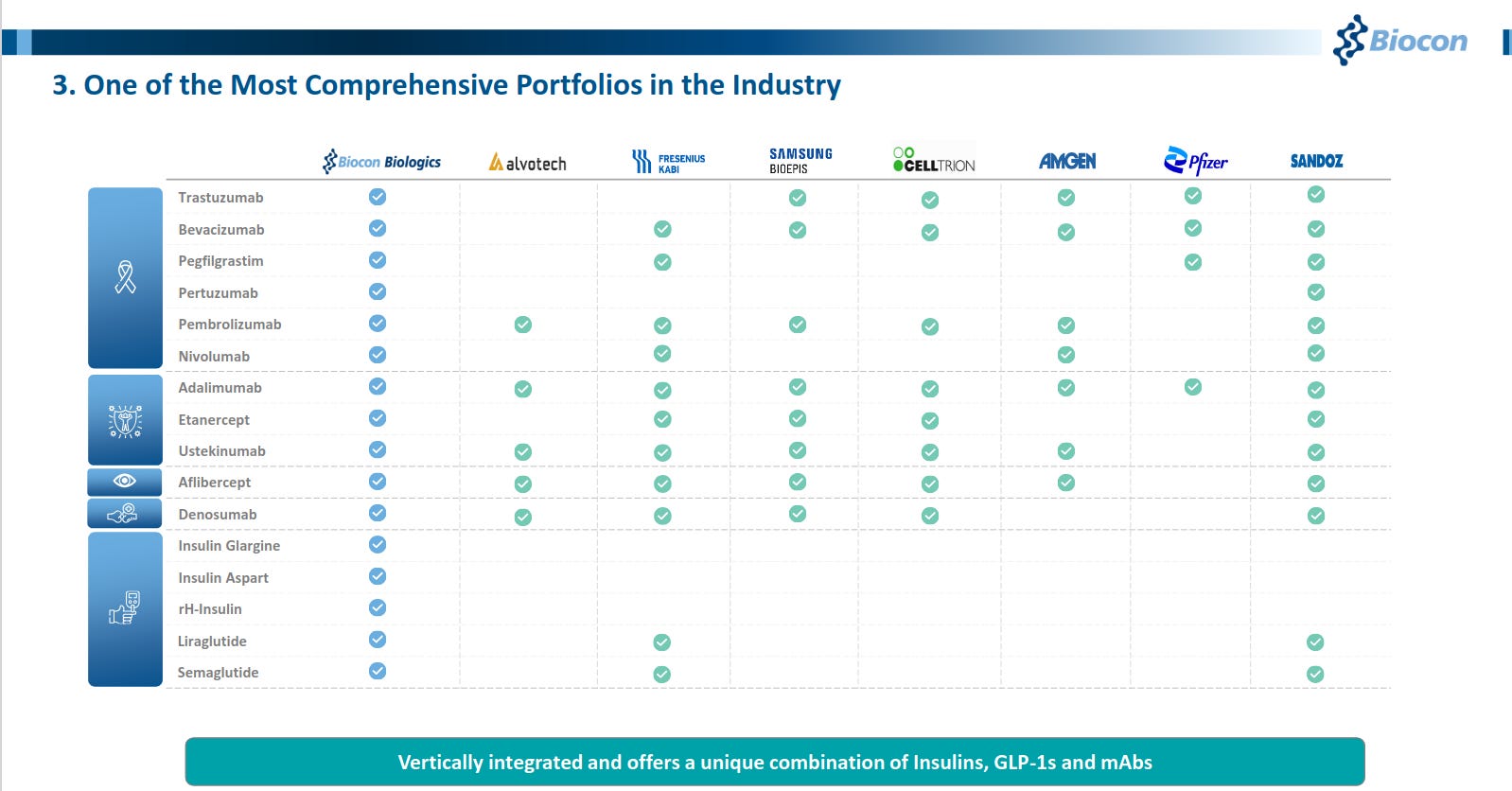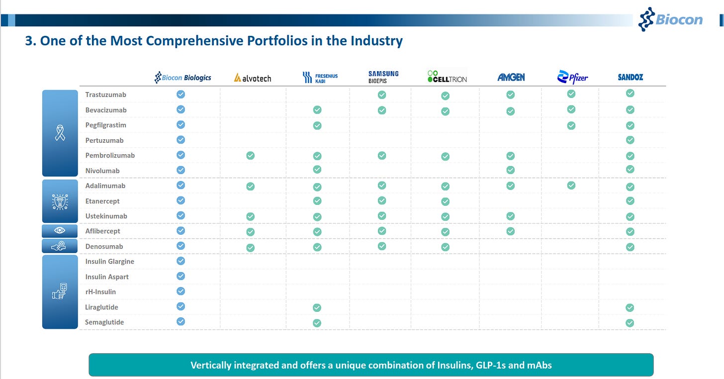 Biocon Biologics has one of the industry’s broadest biosimilar portfolios spanning insulins, GLP-1s, and monoclonal antibodies, comparable with global peers like Pfizer, Amgen, and Samsung Bioepis. Its vertically integrated model strengthens scale, cost efficiency, and long-term competitiveness across therapies.