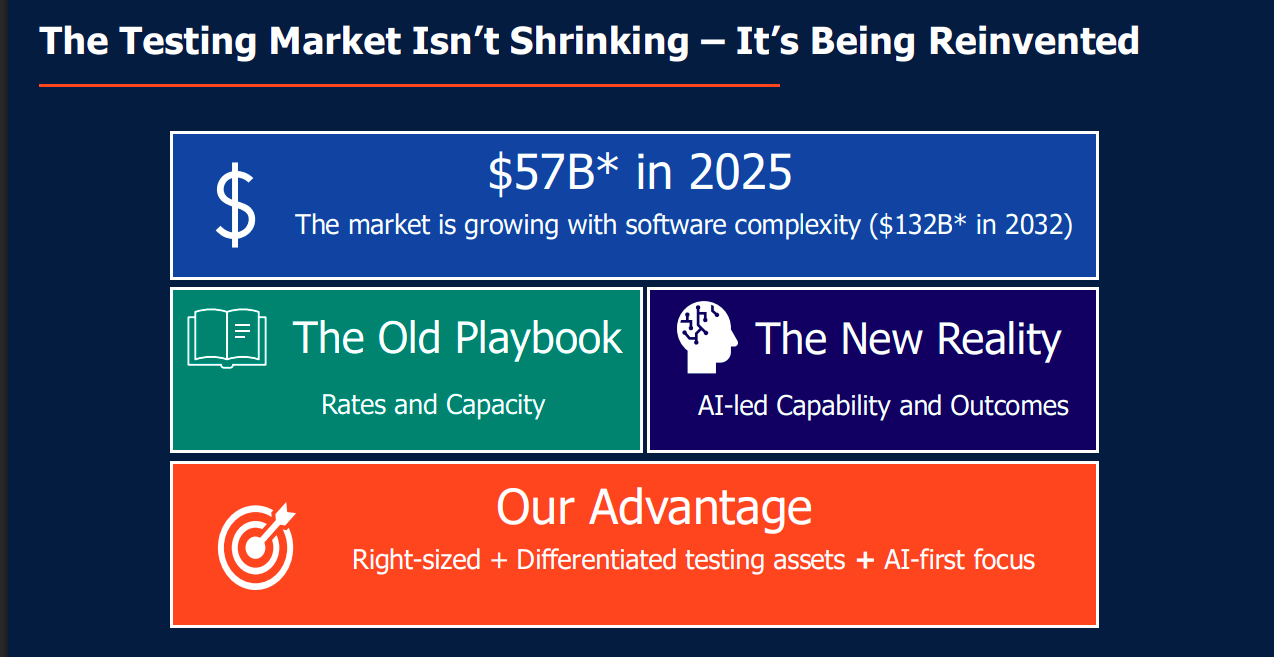 The global software testing market is expanding alongside rising software complexity, reaching ~$57 billion in 2025 and projected to grow sharply by 2032. The industry is shifting away from rate-and-capacity models toward AI-led, outcome-driven testing. Coforge positions itself with right-sized, differentiated testing assets and an AI-first approach as a competitive advantage.