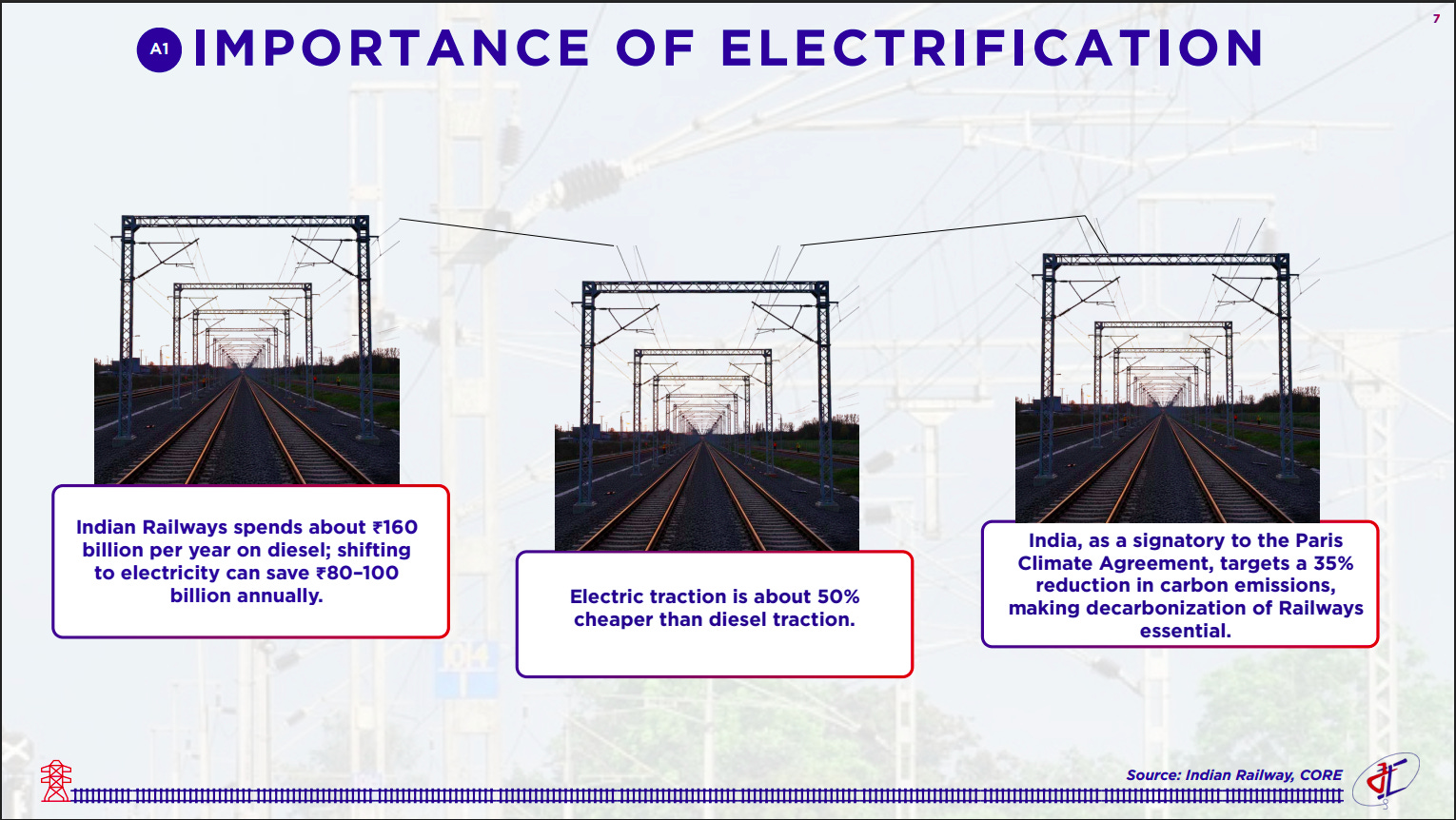 Electrification is a critical economic and environmental lever, with Indian Railways spending ~₹160 billion annually on diesel that can be reduced by ₹80–100 billion through electric traction. Electric traction is ~50% cheaper and supports India’s Paris Climate Agreement goals by accelerating decarbonization of rail transport.