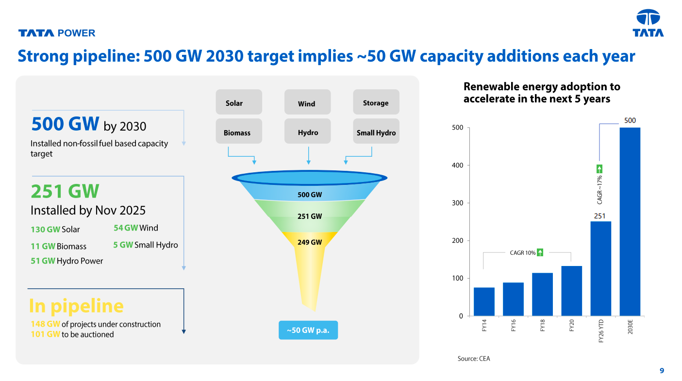 India’s 500 GW non-fossil capacity target by 2030 implies ~50 GW of annual additions, backed by a strong project pipeline. Renewable adoption is expected to accelerate sharply over the next five years, supported by solar, wind, hydro, and storage capacity build-out.