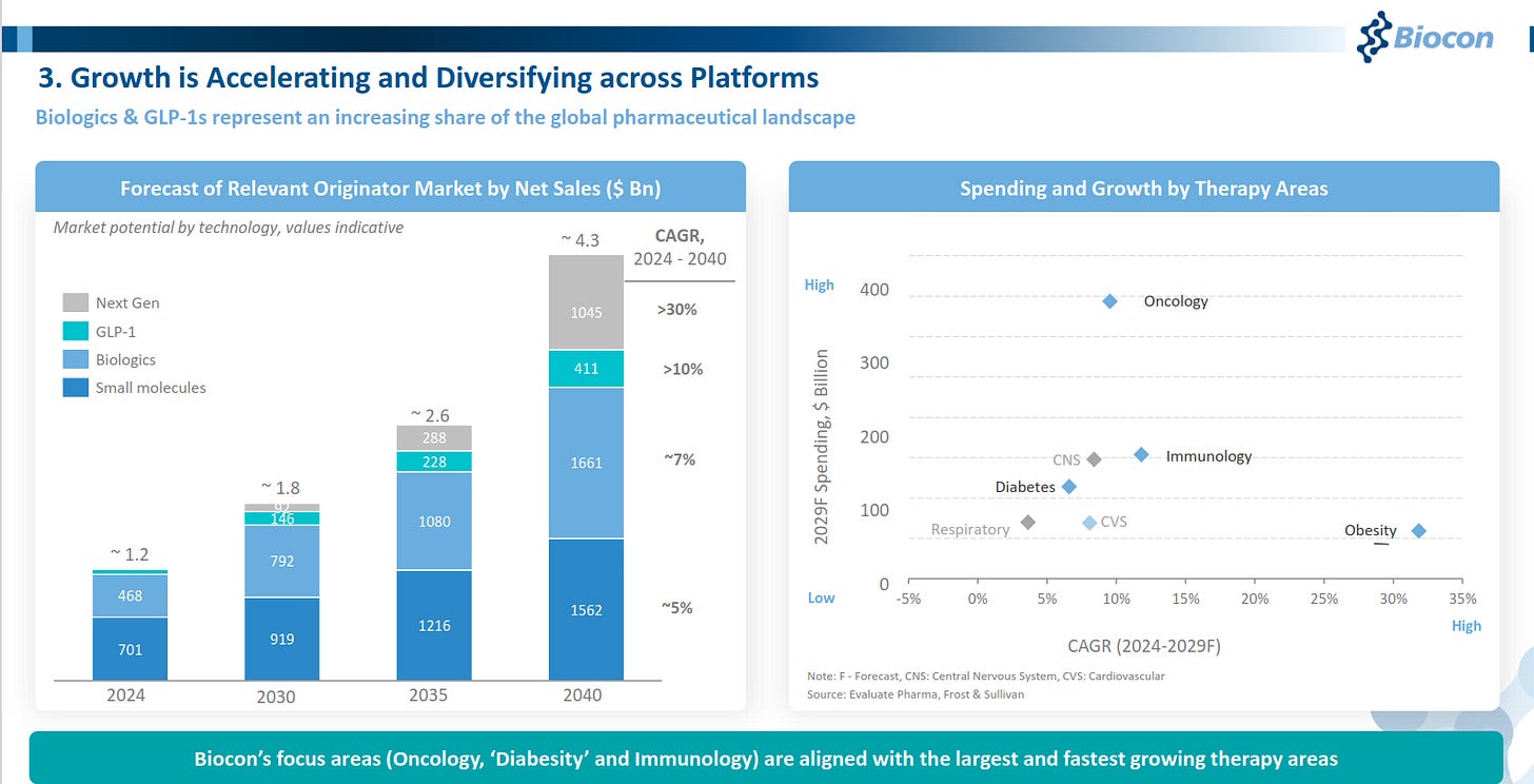 Growth is increasingly driven by biologics and GLP-1s, which are expanding faster than small molecules and gaining share in the global pharma market. Biocon’s focus on oncology, diabetes, and immunology aligns with the largest and fastest-growing therapy areas through 2040.