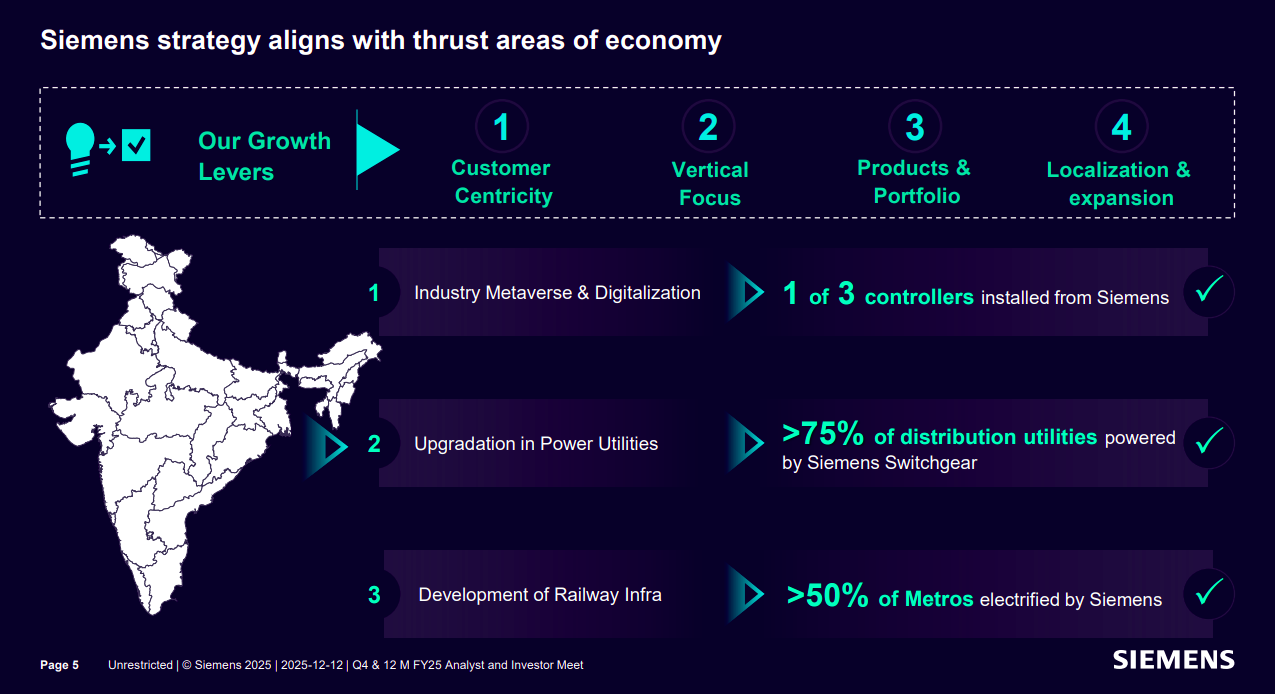 Siemens’ India strategy is anchored around four growth levers—customer centricity, vertical focus, portfolio strength, and localization—to align with key national priorities. The company has a dominant footprint across industry digitization, power utilities, and railways, with over 75% of distribution utilities and more than half of metro electrification powered by Siemens solutions.