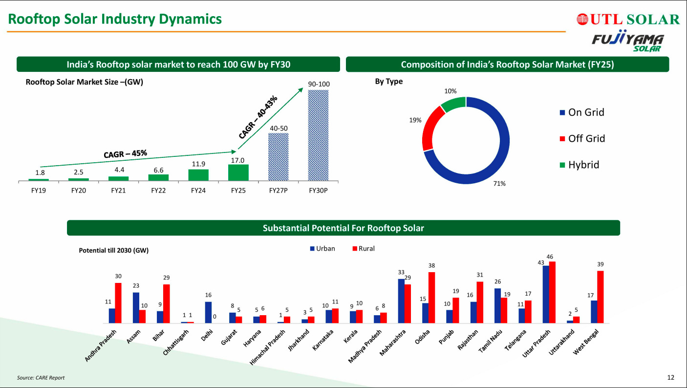 India’s rooftop solar market is on a steep growth trajectory, expected to scale from ~17 GW in FY25 to ~90–100 GW by FY30, implying ~40%+ CAGR. On-grid systems dominate with ~70% share, while hybrid and off-grid solutions cater to niche needs. Significant untapped potential exists across both urban and rural states, driven by policy support and falling costs.