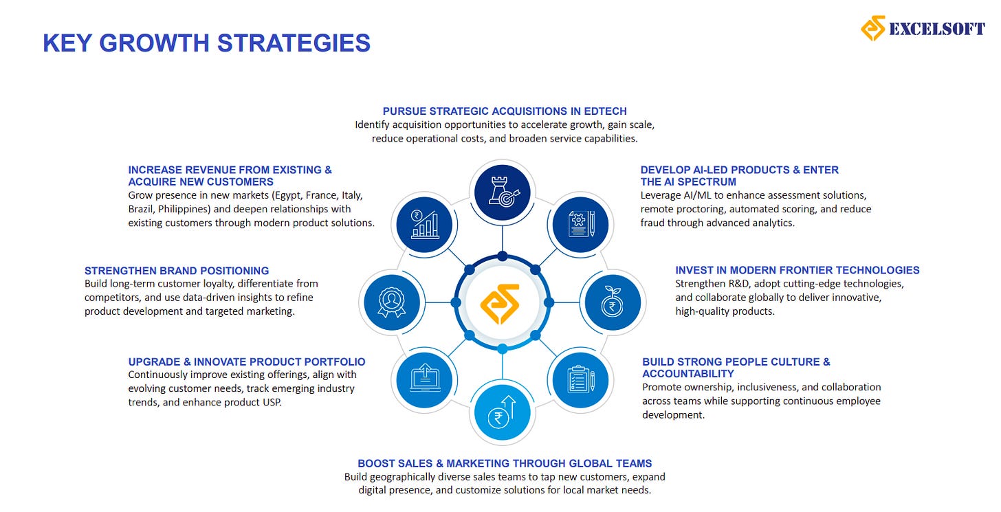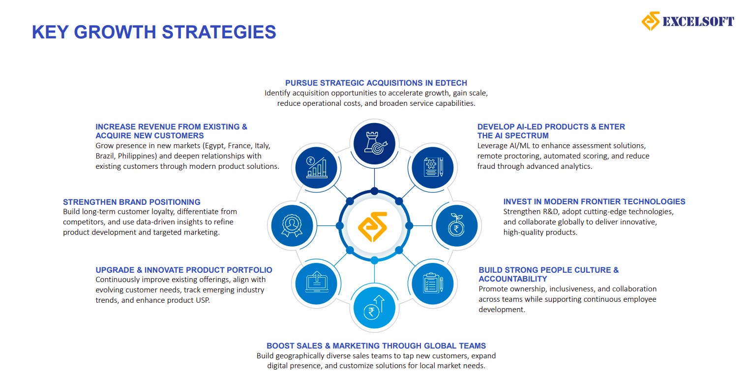 Excelsoft’s growth strategy centers on expanding revenues from existing and new customers, entering new geographies, and strengthening brand positioning. The company is also focused on AI-led product development, strategic acquisitions in EdTech, investments in modern technologies, and building strong global sales teams and people culture.