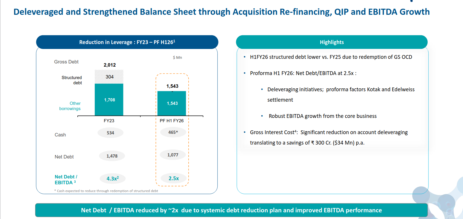 The company has significantly reduced leverage through refinancing, QIP, and strong EBITDA growth, bringing Net Debt/EBITDA down from 4.3x in FY23 to ~2.5x on a pro-forma H1 FY26 basis. Lower structured debt and interest costs are improving cash flows and balance-sheet resilience.