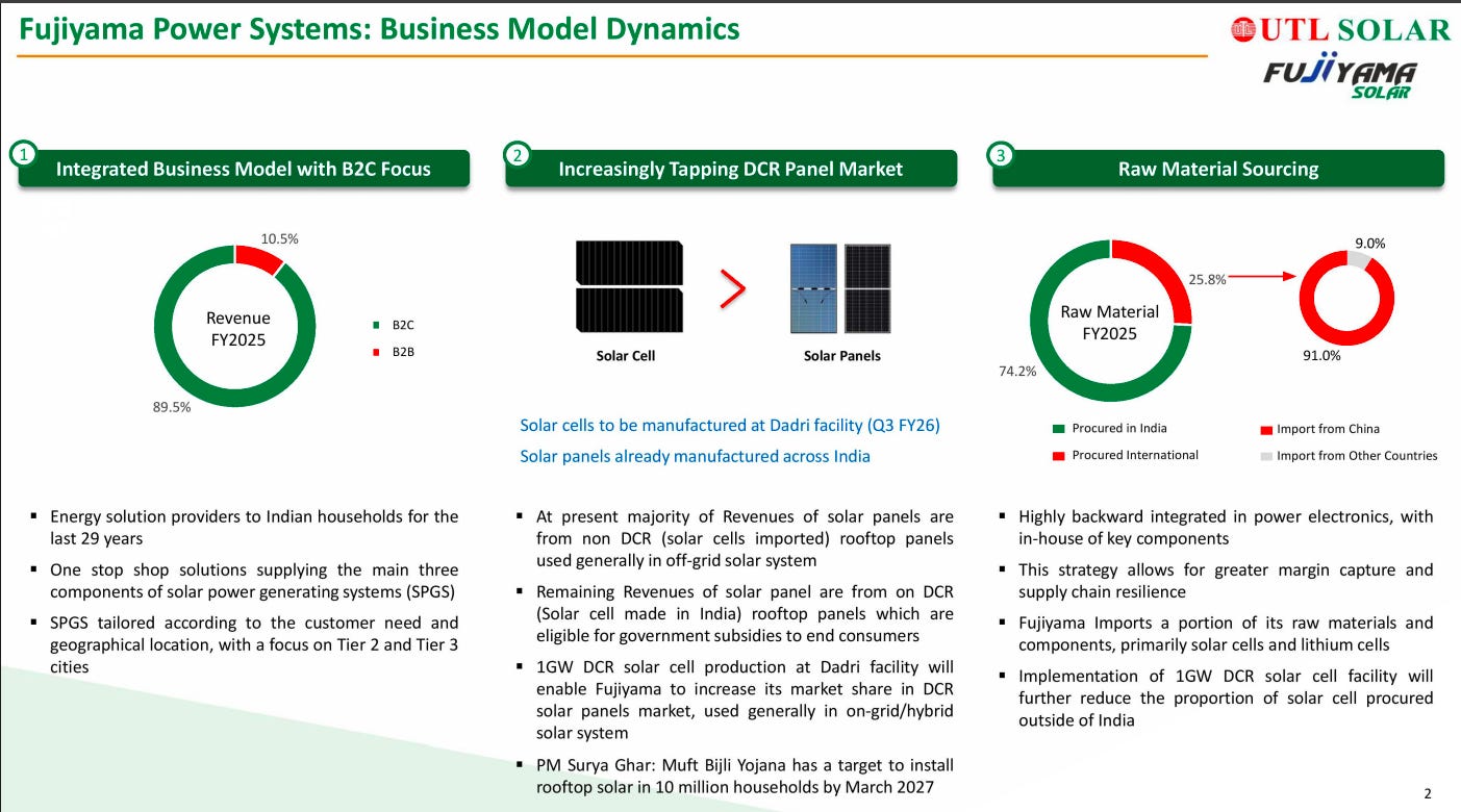 Fujiyama follows a highly integrated, B2C-focused solar business model with ~90% of FY25 revenues coming from retail consumers. The company is increasingly shifting toward DCR panels through in-house solar cell manufacturing, which should improve margins and reduce import dependence. Backward integration in power electronics strengthens supply-chain resilience and profitability.